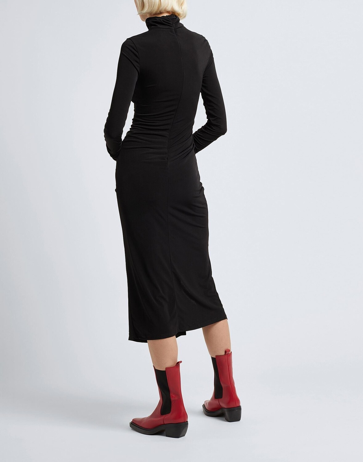 Это платье миди отличается облегающим кроем и игривым драпированным дизайном. Сделано в Италии, оно выполнено из однотонного джерси, имеет длинные рукава, высокий воротник и застежку-молнию. На модели итальянский размер S/40. Этот предмет одежды содержит цифровой идентификатор, что означает, что вы можете открыть для себя целый мир эксклюзивного контента о своем изделии; отсканируйте QR-код на этикетке по уходу за товаром.