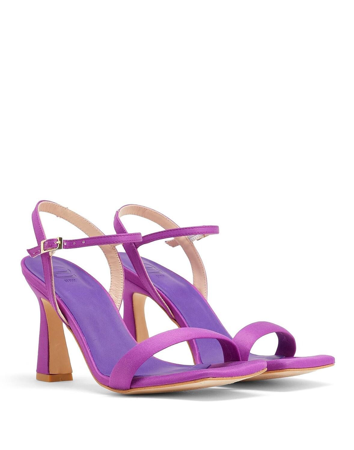 Эти сандалии имеют квадратный нос и ремешок с пряжкой на щиколотке. Выполнены из однотонного атласа, имеют резиновую подошву и каблук в тон-сюр-тон.