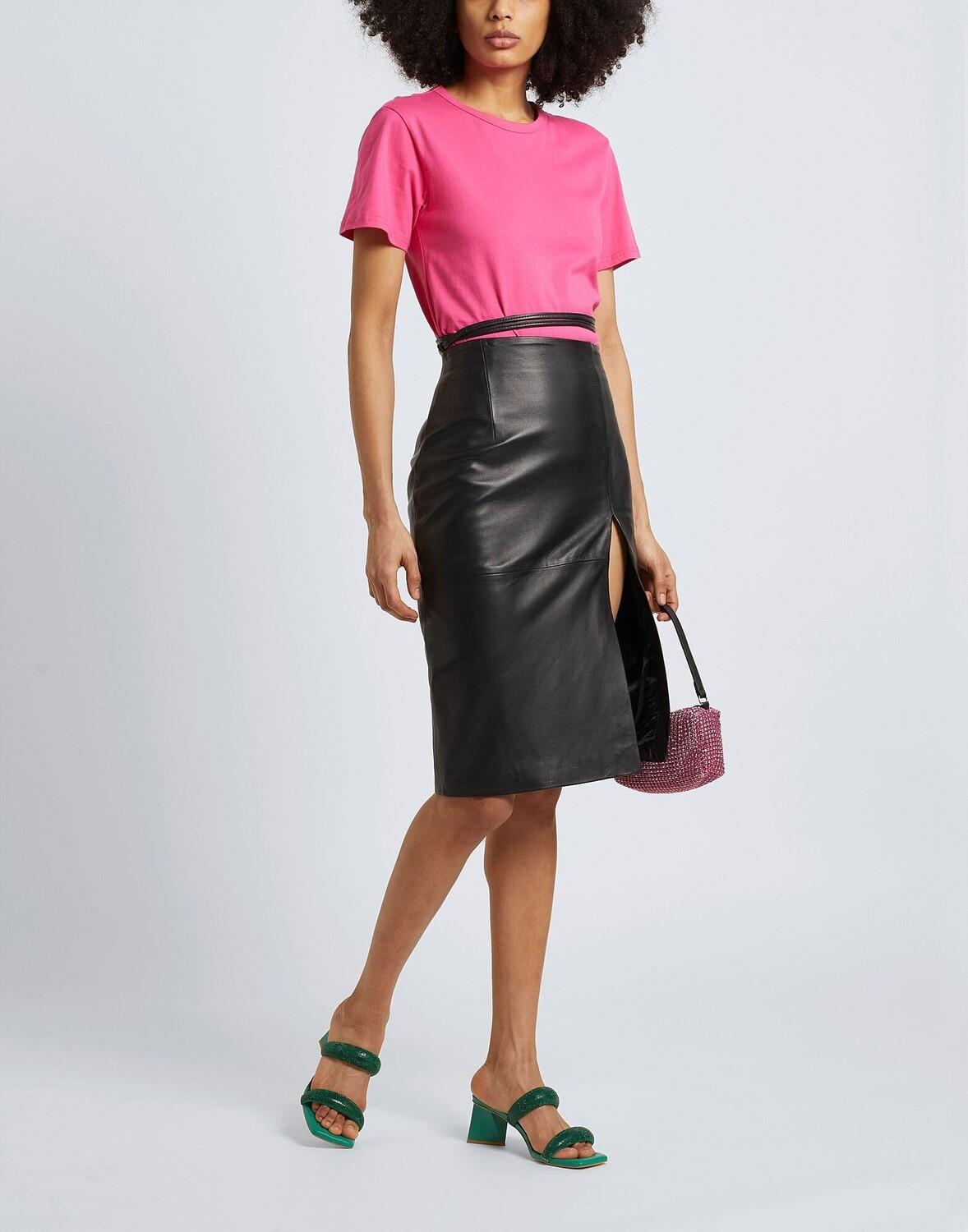 Однотонная кожаная юбка-миди слегка расклешенного силуэта, оснащенная спереди поясом в тон. Сделано в Италии, имеет внутреннюю подкладку, разрез спереди и застежку-молнию. На модели итальянский размер S/40. Этот предмет одежды содержит цифровой идентификатор, что означает, что вы можете открыть для себя целый мир эксклюзивного контента о своем изделии; отсканируйте QR-код на этикетке по уходу за товаром.