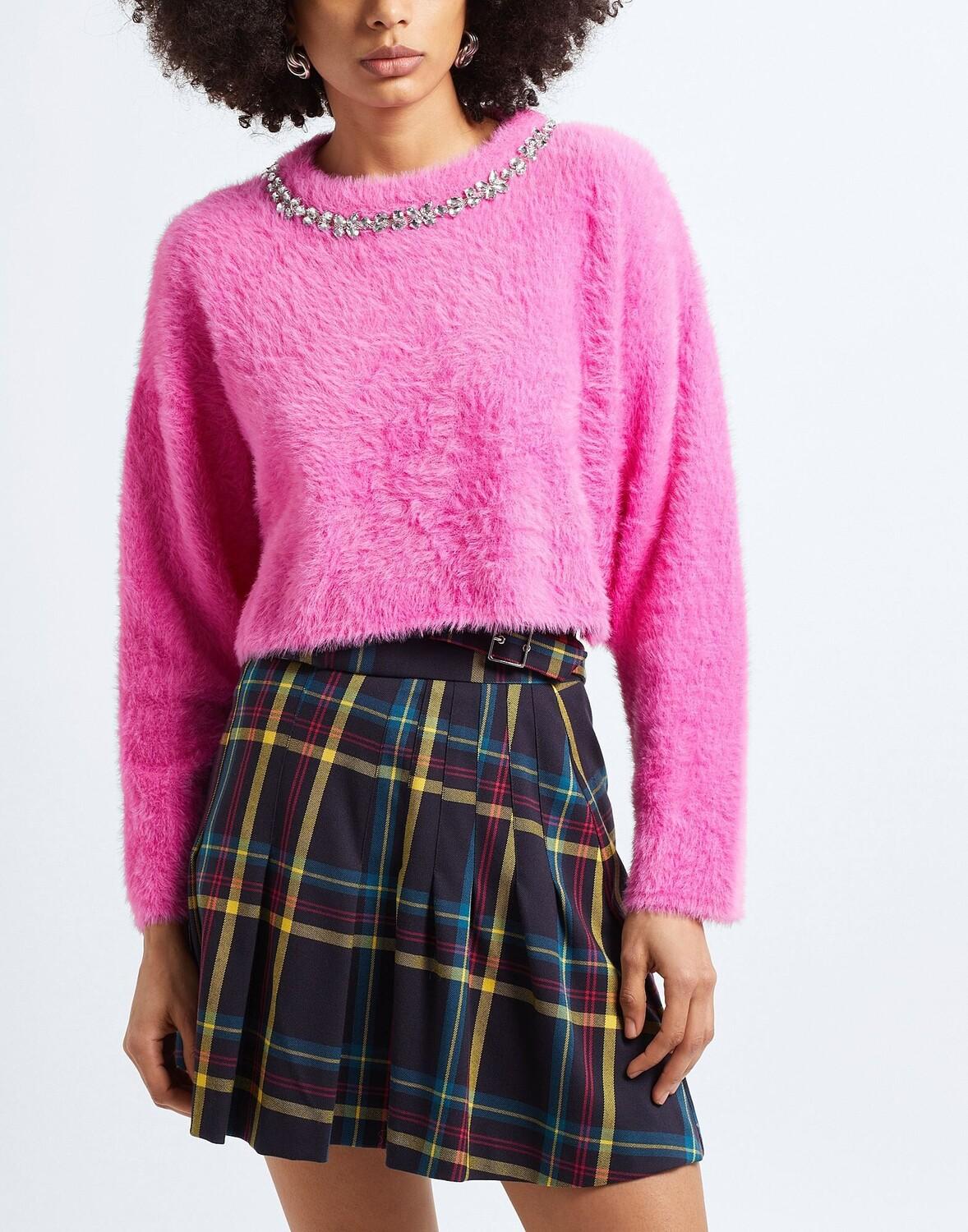 Этот свитер с длинными рукавами украшен стразами на вырезе. Сделано в Италии и представлено в однотонном цвете, оно выделяется круглым вырезом и легкой текстурой. Модель одета в итальянский размер S/40. Этот предмет одежды содержит цифровой идентификатор, что означает, что вы можете открыть для себя целый мир эксклюзивного контента о своем изделии; отсканируйте QR-код на этикетке по уходу за товаром.