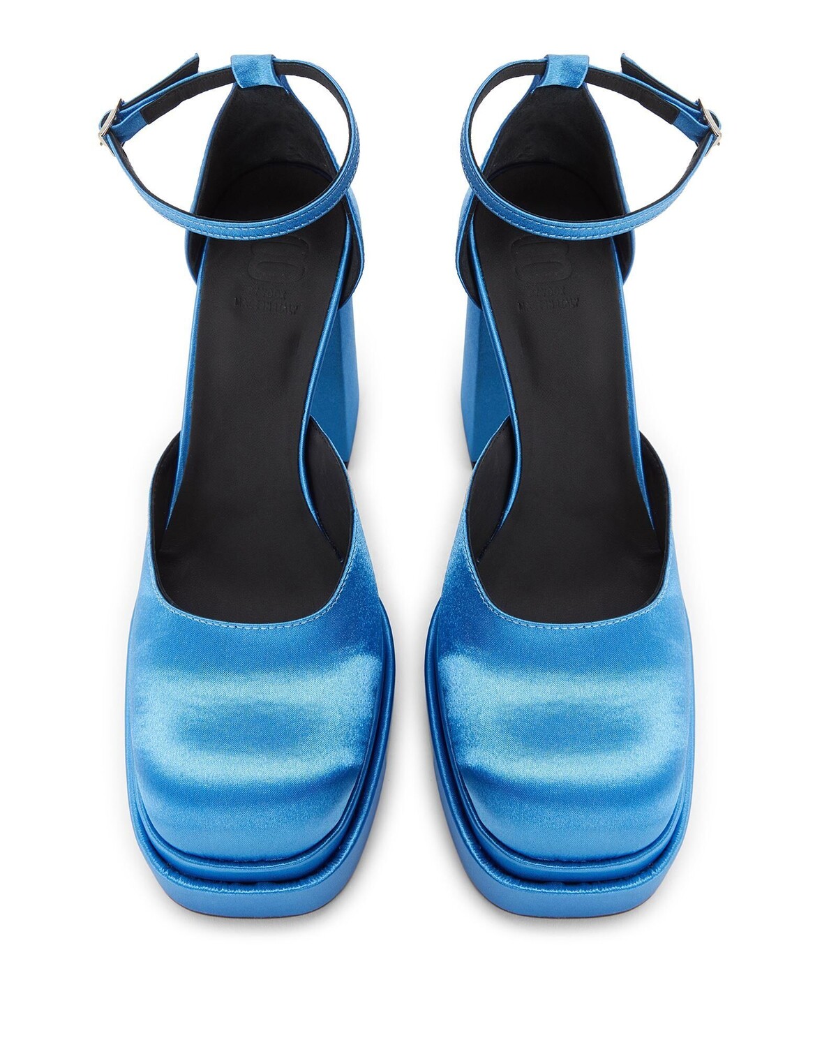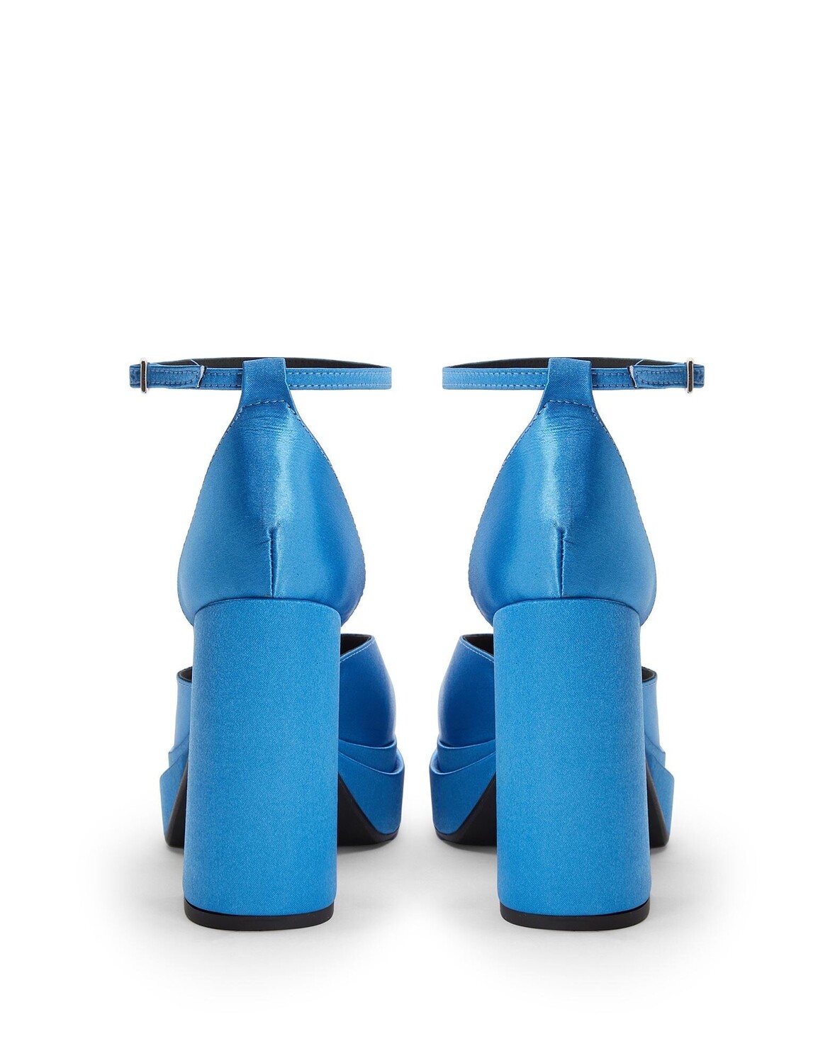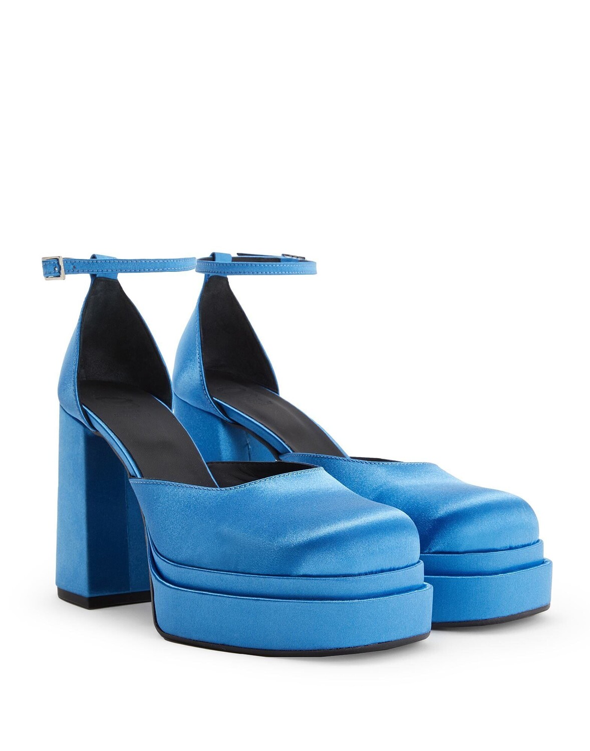 Эти туфли-лодочки, изготовленные в Италии из простого атласа, имеют подошву на платформе и блочный каблук. Они оснащены резиновой подошвой и регулируемым ремешком на щиколотке.