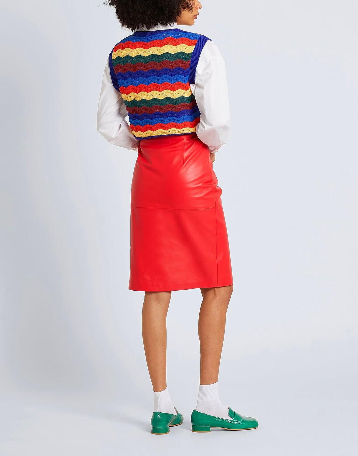 Однотонная кожаная юбка-миди слегка расклешенного силуэта, оснащенная спереди поясом в тон. Сделано в Италии, имеет внутреннюю подкладку, разрез спереди и застежку-молнию. На модели итальянский размер S/40. Этот предмет одежды содержит цифровой идентификатор, что означает, что вы можете открыть для себя целый мир эксклюзивного контента о своем изделии; отсканируйте QR-код на этикетке по уходу за товаром.