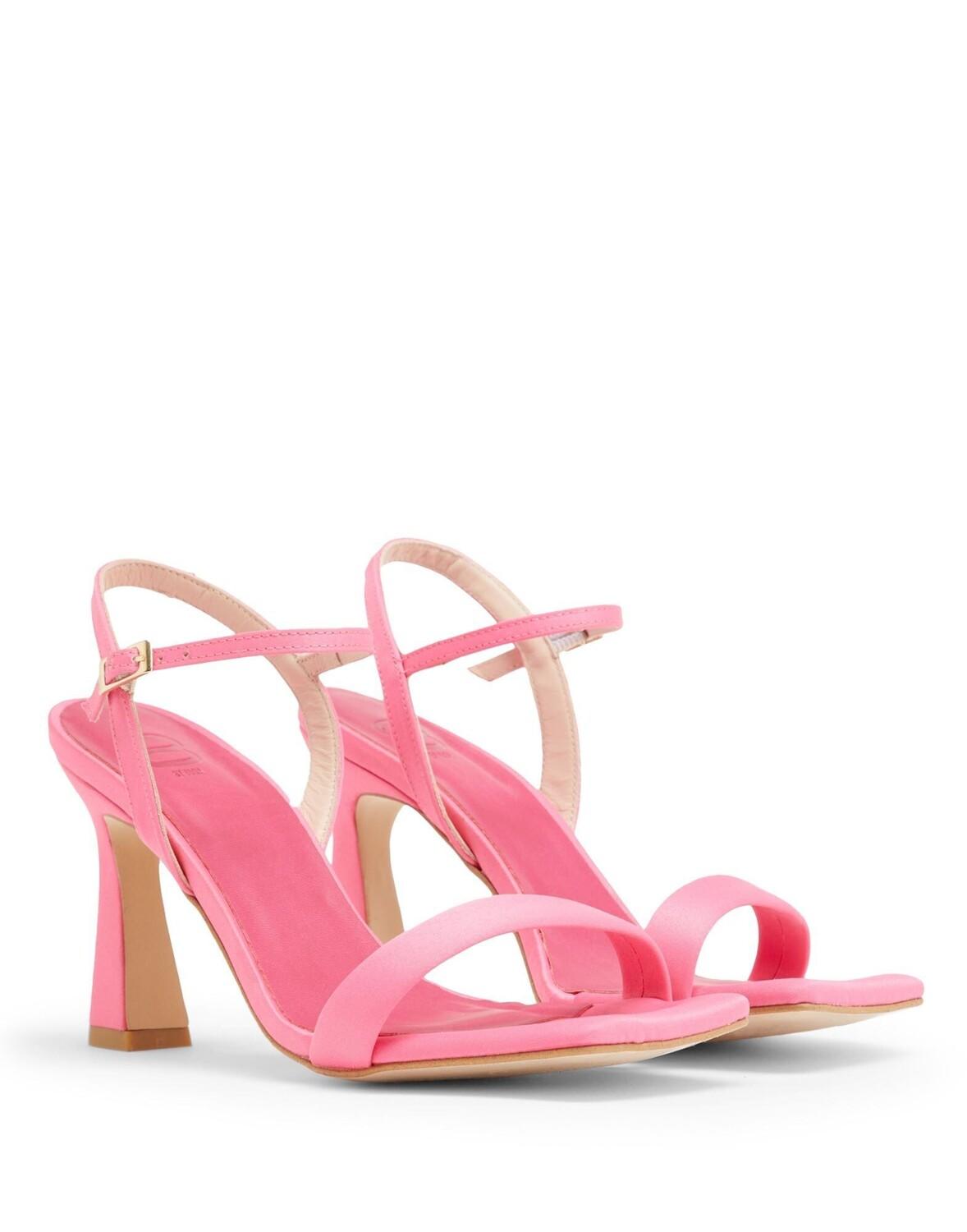 Эти сандалии имеют квадратный нос и ремешок с пряжкой на щиколотке. Выполнены из однотонного атласа, имеют резиновую подошву и каблук в тон-сюр-тон.
