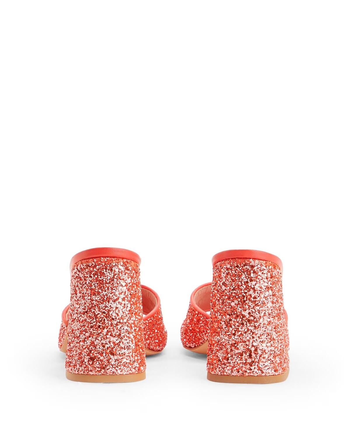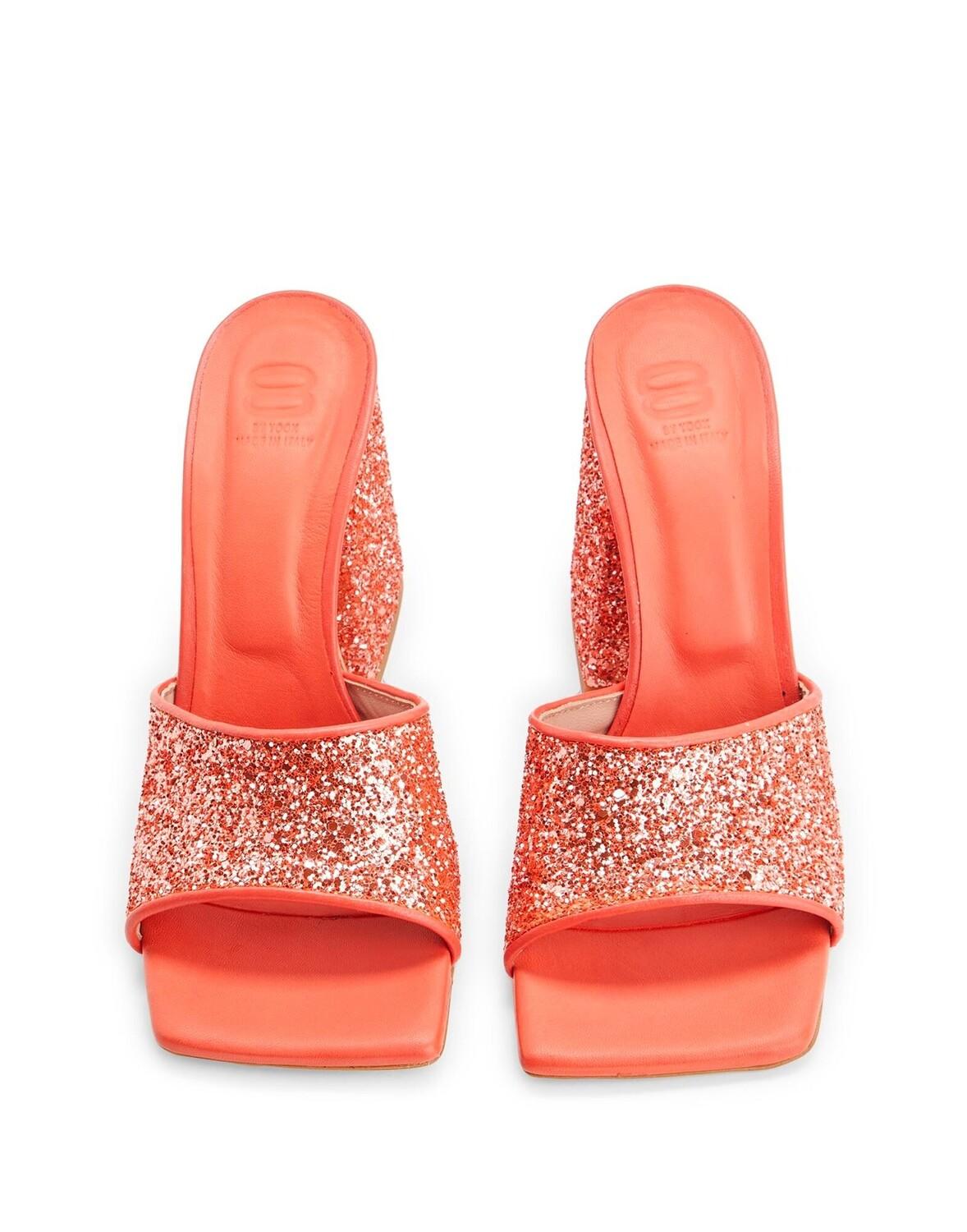 Однотонные сандалии из ткани с покрытием, украшенные блестками, с квадратным носком. Сделаны в Италии, внутри отделаны кожей, оснащены резиновой подошвой и каблуком геометрической формы.