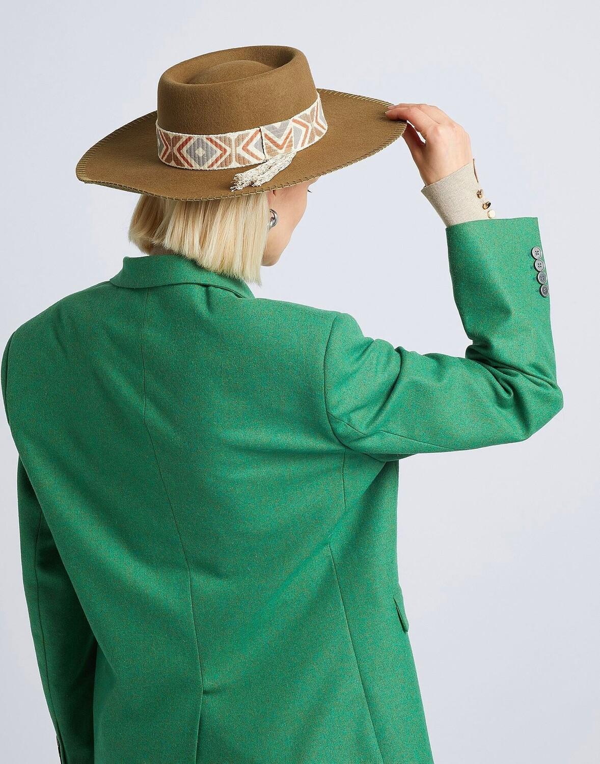 Эта шляпа итальянского производства изготовлена ​​из однотонного шерстяного фетра. У него средние поля, а основание короны украшено полосой с геометрическим узором и бахромой.