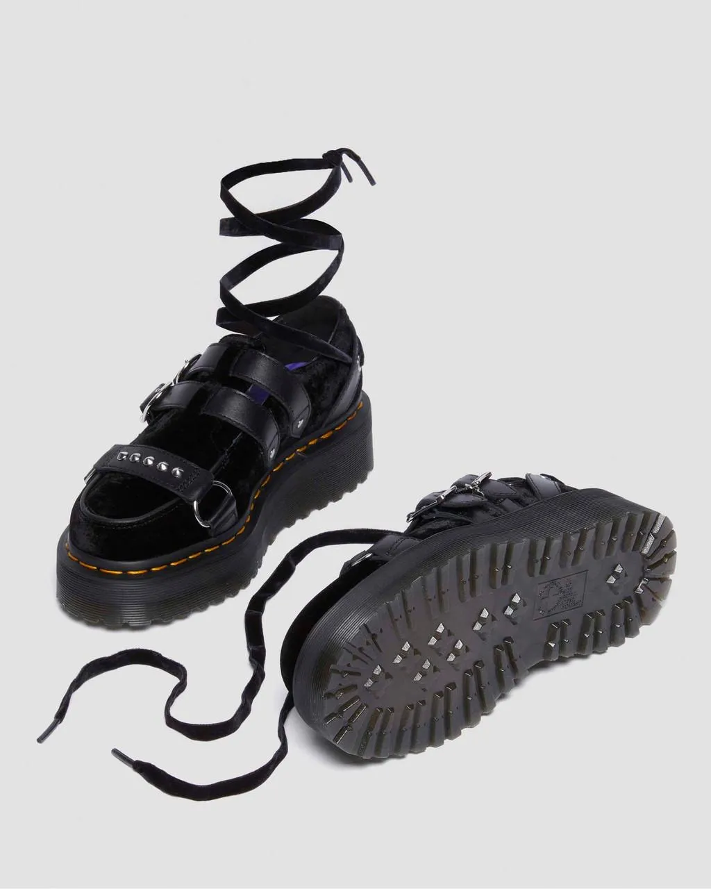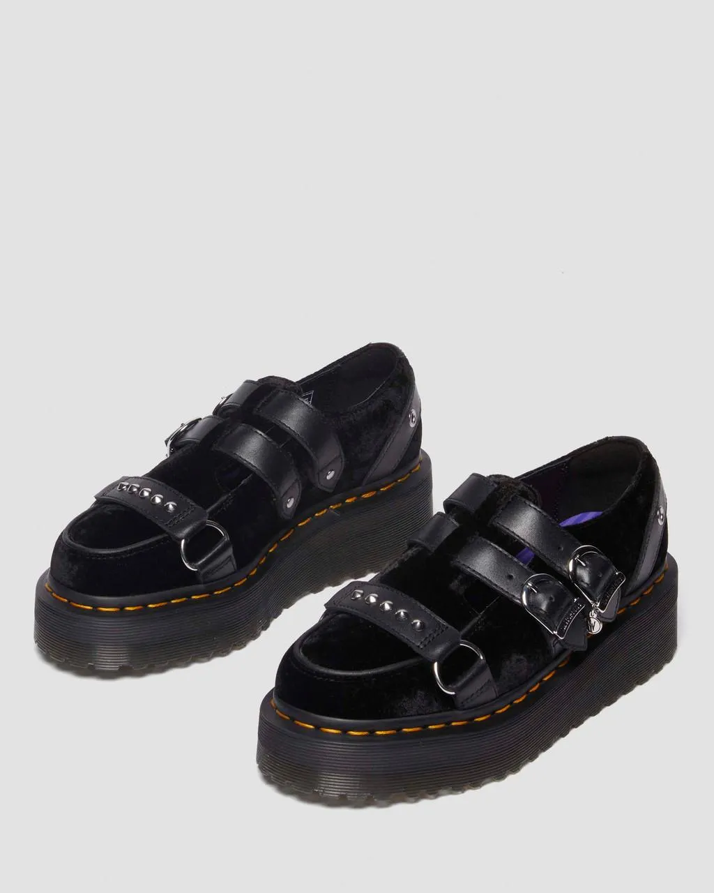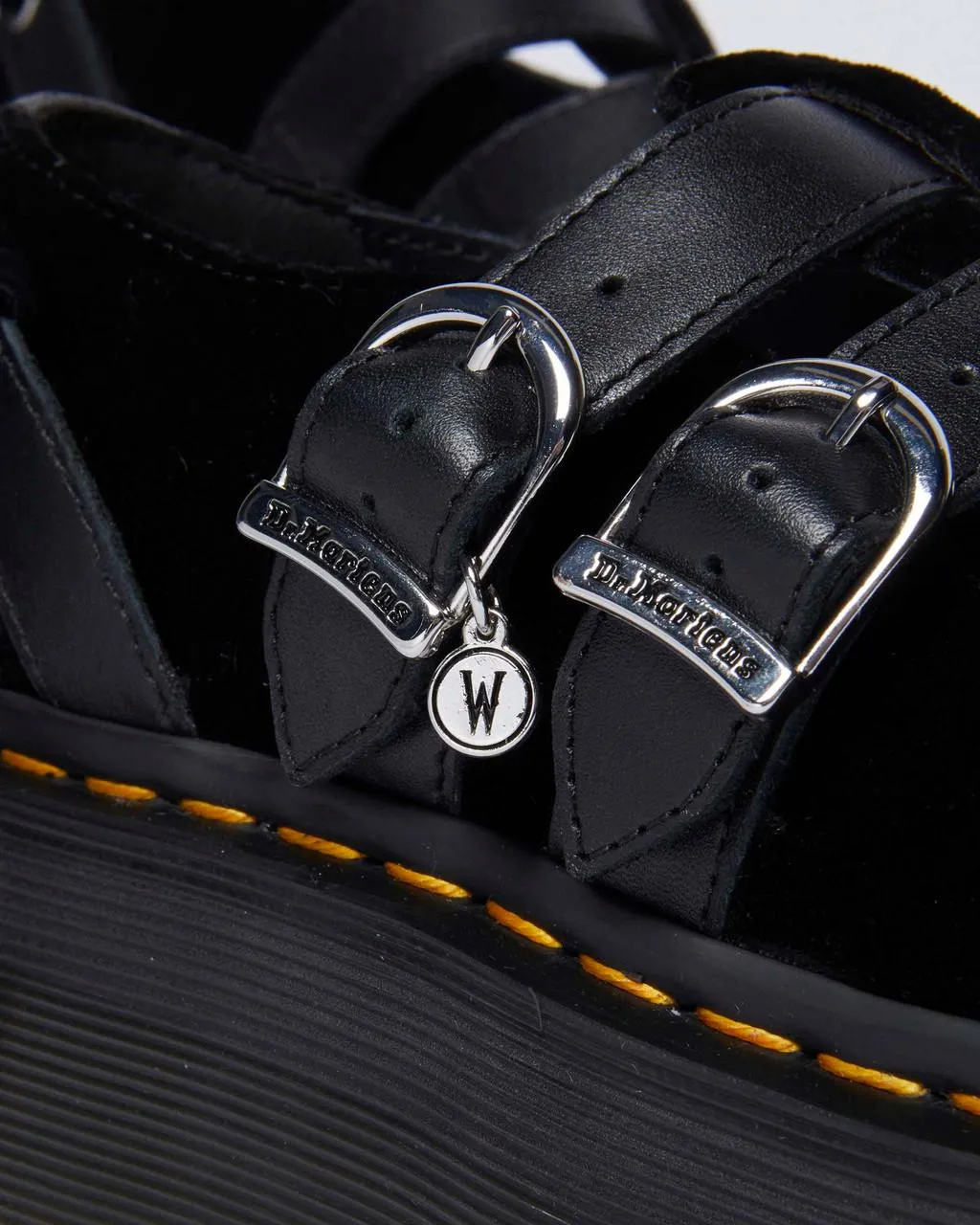 Эти кроссовки на платформе, выпущенные ограниченным тиражом, из коллекции DM's x Wednesday, сочетают бархатный верх с кожаными ремешками Wanama и дет. Изгои в моде. Эти кроссовки на платформе, выпущенные ограниченным тиражом, из нашей коллекции DM's x Wednesday, сочетают в себе бархатный верх с кожаными ремешками Wanama и деталями. Обувь фиксируется с помощью двух регулируемых ремешков с пряжками и съемного плоского шнурка, который обхватывает лодыжку и голень — в зависимости от того, как вы ее завязываете. Пряжки имеют фирменный знак DM и украшены подвеской в ​​виде буквы W, а ремешок с заклепками проходит через союзку.