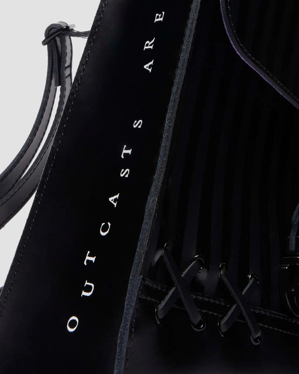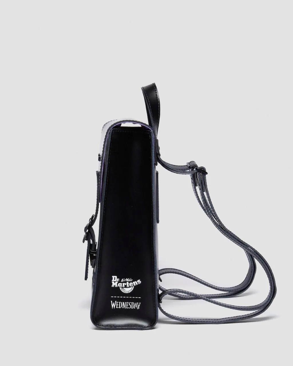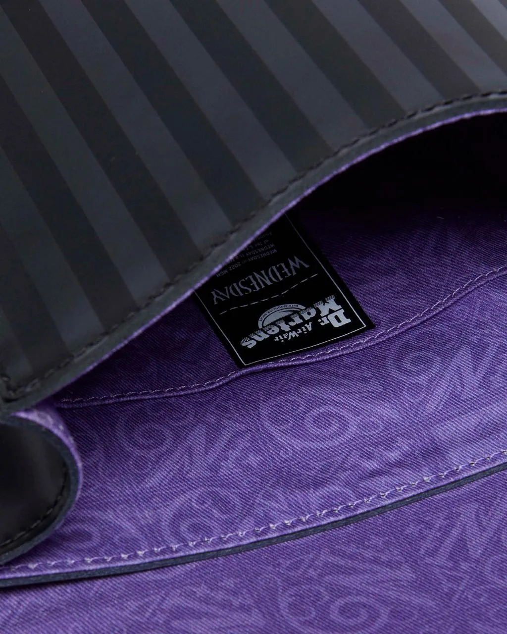 Изгои здесь. Этот мини-рюкзак, выпущенный ограниченным тиражом от коллаборации нашего DM x Wednesday, выполнен из гладкой и киевской кожи с глянцевыми полосками ac... Изгои в моде. Этот мини-рюкзак, выпущенный ограниченным тиражом от коллаборации DM's x Wednesday, выполнен из гладкой и киевской кожи с глянцевыми полосками спереди и на клапане. Сумка украшена деталями, вдохновленными средой, включая кожаное кружево, пряжку в виде паутины и съемный брелок с изображением Уэнсдей и витража в спальне Энид. На боковых панелях напечатан белый текст с надписью «ИЗГОНКИ ARE IN», а на эффектной фиолетовой подкладке напечатан логотип Nevermore Academy.