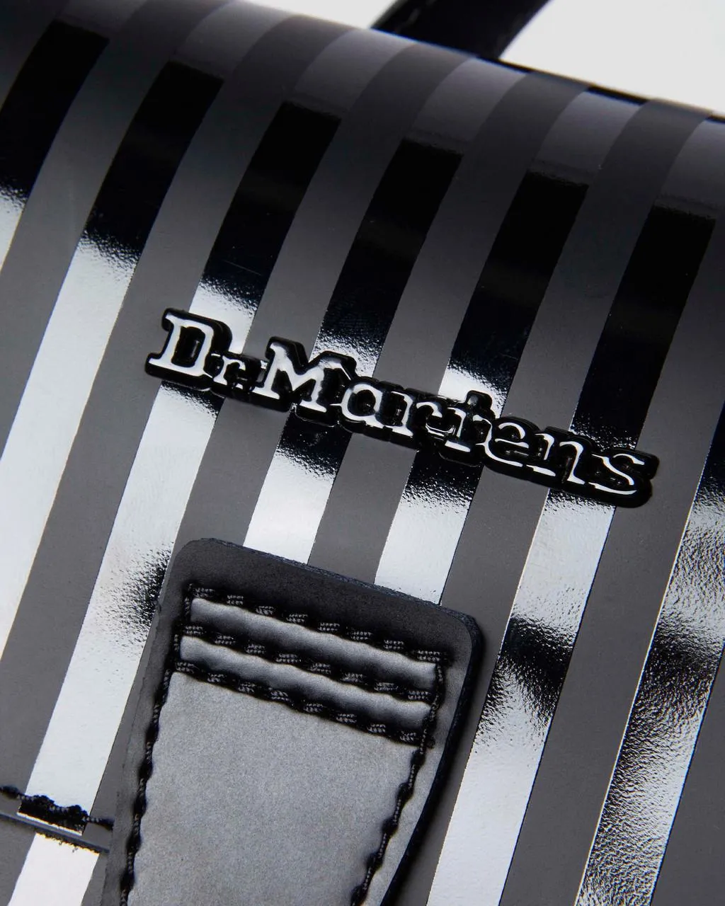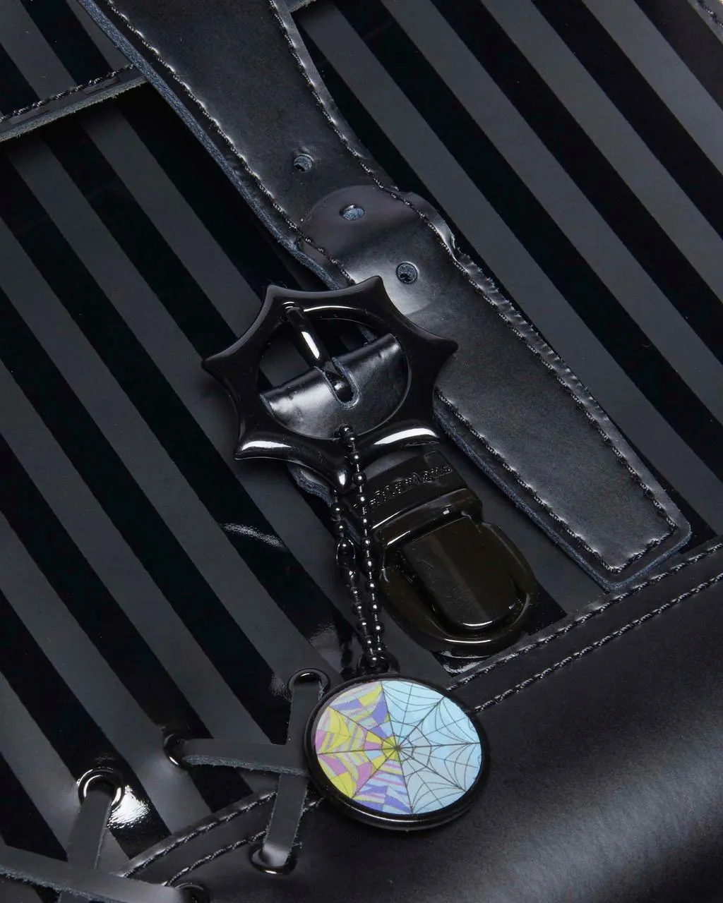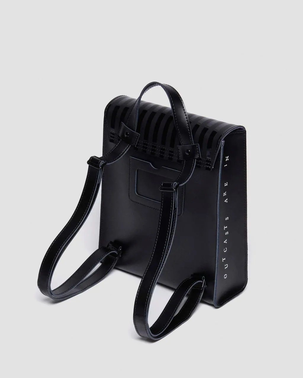 Изгои здесь. Этот мини-рюкзак, выпущенный ограниченным тиражом от коллаборации нашего DM x Wednesday, выполнен из гладкой и киевской кожи с глянцевыми полосками ac... Изгои в моде. Этот мини-рюкзак, выпущенный ограниченным тиражом от коллаборации DM's x Wednesday, выполнен из гладкой и киевской кожи с глянцевыми полосками спереди и на клапане. Сумка украшена деталями, вдохновленными средой, включая кожаное кружево, пряжку в виде паутины и съемный брелок с изображением Уэнсдей и витража в спальне Энид. На боковых панелях напечатан белый текст с надписью «ИЗГОНКИ ARE IN», а на эффектной фиолетовой подкладке напечатан логотип Nevermore Academy.