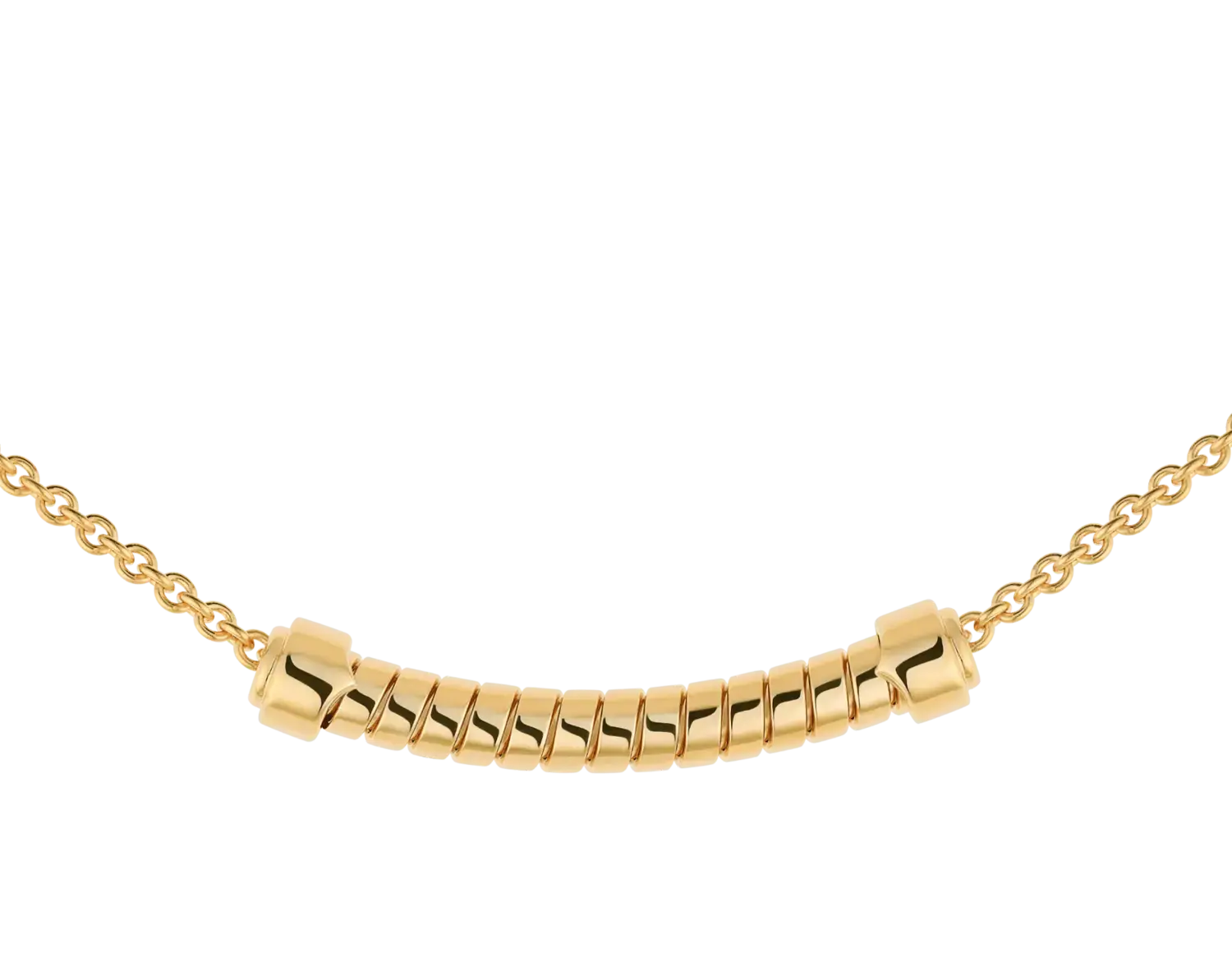 Колье Bvlgari Tubogas из желтого золота 18 карат. Возвышая ювелирную технику, которую лелеял римский Дом с 1940-х годов, до культовой коллекции, Bvlgari Tubogas переплетает прошлое и будущее, как свидетельство стремления Bvlgari к экспериментам и его способности превращать драгоценный металл в живую материю. Рожденное из авангардного сочетания промышленного дизайна и превосходного ремесленного мастерства, колье Bvlgari Tubogas из простого 18-каратного желтого золота воплощает вечно современный стиль линии в его чистой, но отличительной эстетике.