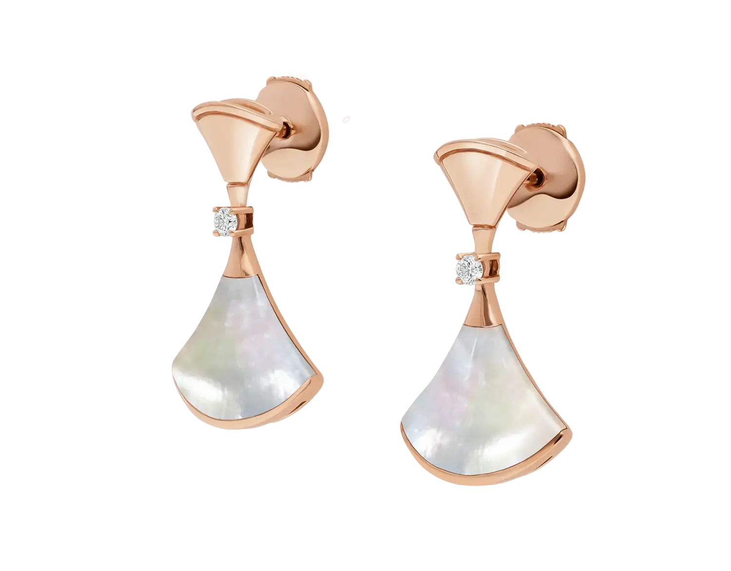 Серьги-подвески Divas' Dream в форме веера из 18-каратного розового золота с перламутром и бриллиантом круглой огранки. Вдохновленные женской элегантностью и очарованием вечного города, серьги-подвески Divas' Dream из 18-каратного розового золота с перламутровой вставкой и бриллиантом круглой огранки отдают дань уважения самым гламурным дивам с несомненным римским духом. Квинтэссенция женственности и утонченности, серьги скульптурно передают великолепие мрамора терм Каракаллы и чувственные изгибы его веерообразных мозаик, отражая саму суть итальянской красоты. Серьги Divas' Dream из 18-каратного розового золота с перламутром и бриллиантами.