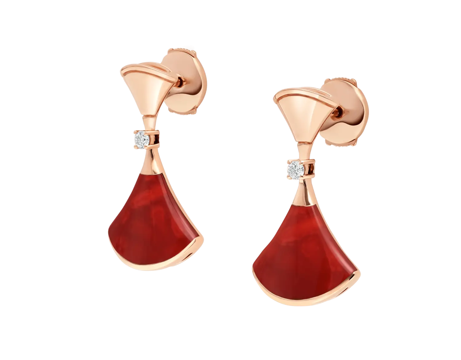 Серьги Divas' Dream из розового золота 18 карат, украшенные сердоликом и круглыми бриллиантами классической огранки. Олицетворяя итальянскую элегантность, серьги Divas' Dream олицетворяют наследие дивы с ее таинственным, незабываемым очарованием. Квинтэссенция женственности и утонченности, веерообразный мотив сережек черпает вдохновение из мозаики римских терм Каракаллы, отражая неотъемлемую связь Bvlgari с Вечным городом через современный дизайн и изысканное сочетание драгоценных камней. Серьги Divas' Dream из розового золота 18 карат со вставками из сердолика и круглыми бриллиантами бриллиантовой огранки.