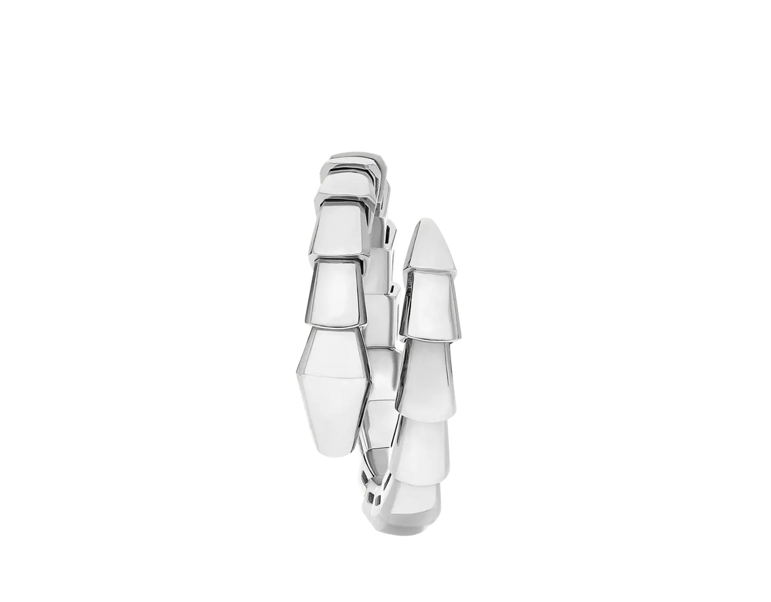 Кольцо Serpenti Viper с одной спиралью из 18-каратного белого золота. Кольцо Serpenti Viper из 18-каратного белого золота с его фирменным сочетанием чистой эстетики, обволакивающих форм и харизматичного стиля является неотъемлемой интерпретацией символа бесконечных метаморфоз Bvlgari. Отражая мощную и постоянно меняющуюся природу мифического змея, это магнетическое ювелирное творение вдохновляет нас принимать перемены как источник силы и уверенности в себе. Легкое в комбинировании, кольцо предлагает бесконечные возможности для стилизации, воплощая универсальный дух коллекции.