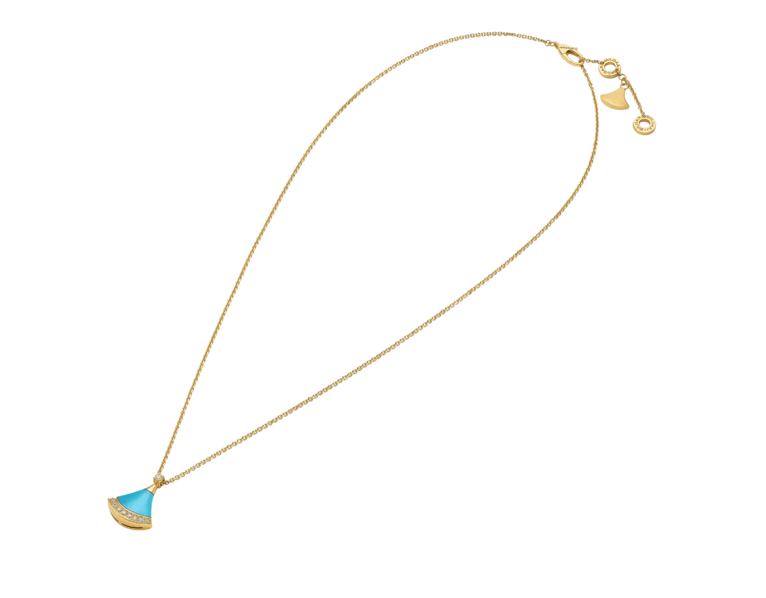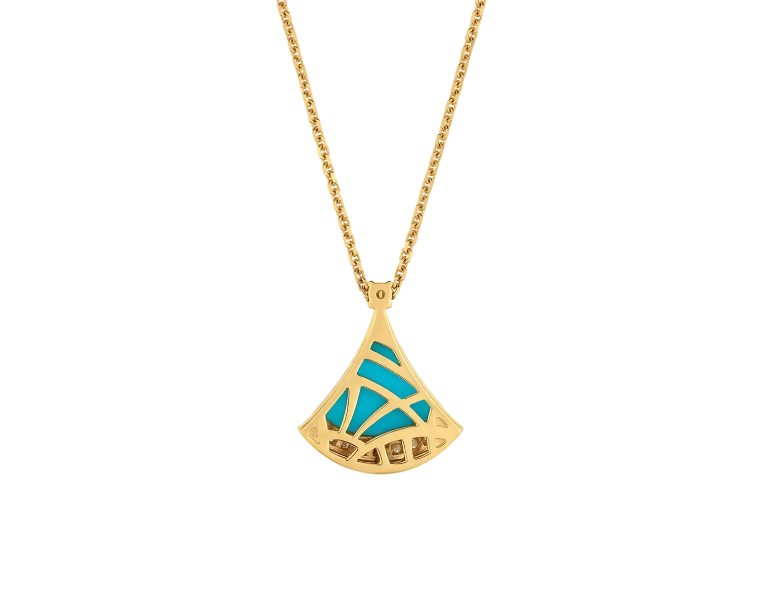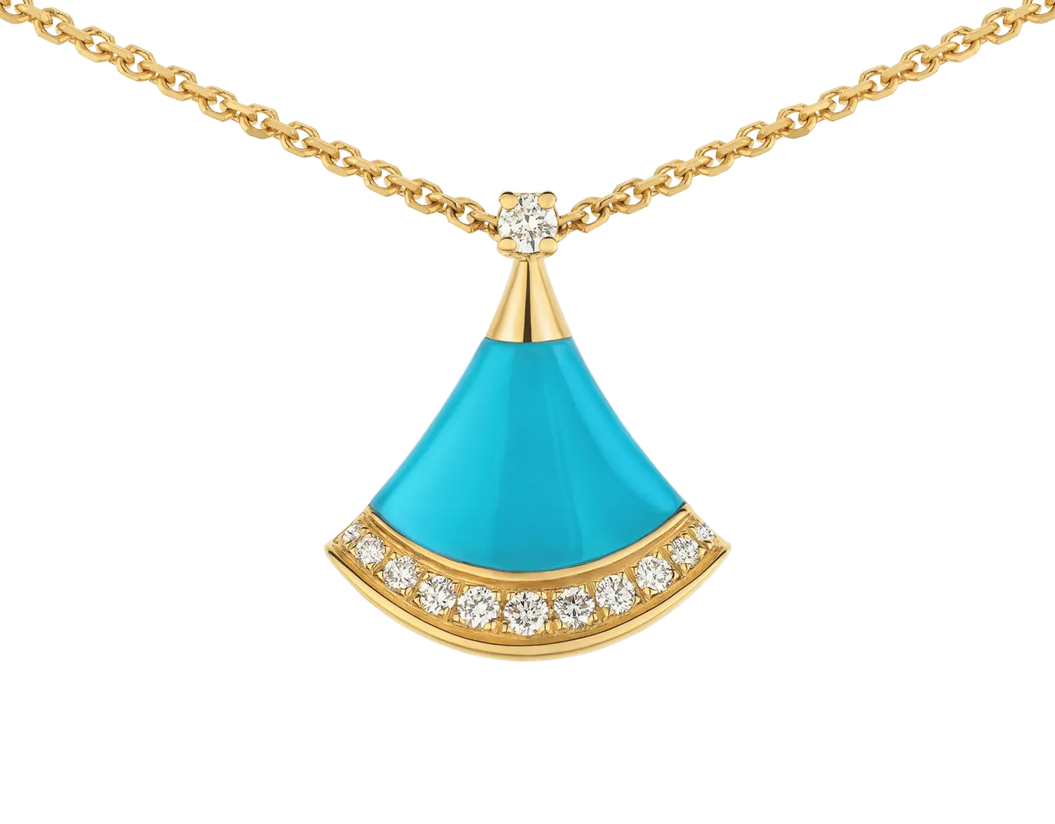 Колье Divas' Dream из 18-каратного желтого золота с бирюзовым элементом, круглым бриллиантом классической огранки и бриллиантовым паве. Изысканное выражение радостной женственности, колье Divas' Dream из 18-каратного желтого золота предлагает красочную и яркую интерпретацию культового веерообразного мотива. Глубоко укорененная в римском наследии Bvlgari, эстетическая подпись коллекции представлена через изящный дизайн, искусно инкрустированный бирюзовым элементом и освещенный бриллиантовым паве. Изящное и вневременное, это творение является одой спонтанной красоте.