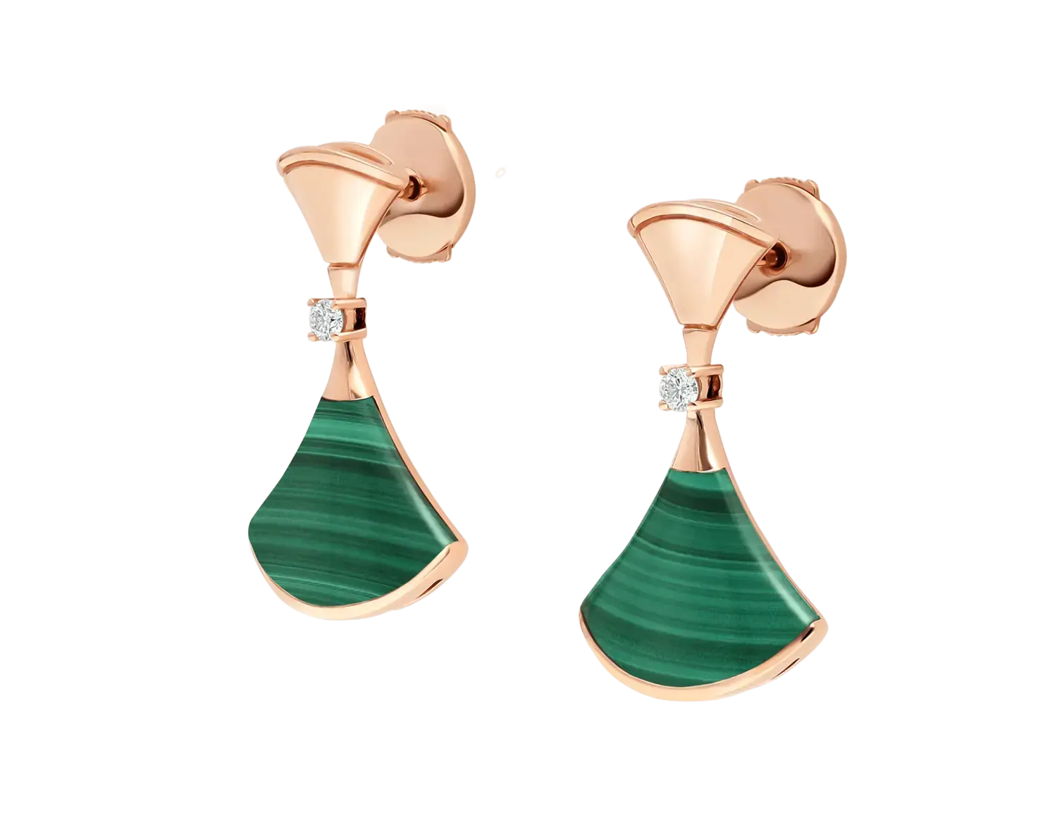 Серьги Divas' Dream из розового золота 18 карат с элементами малахита и круглыми бриллиантами классической огранки. Олицетворяя итальянскую элегантность, серьги Divas' Dream воплощают легенду о диве с ее таинственным, незабываемым очарованием. Квинтэссенция женственности и утонченности, веерообразный мотив кольца черпает вдохновение из мозаики римских терм Каракаллы, отражая неотъемлемую связь Bvlgari с Вечным городом через современный дизайн и изысканное сочетание драгоценных камней. Серьги Divas' Dream из розового золота 18 карат с малахитовыми вставками и круглыми бриллиантами бриллиантовой огранки.