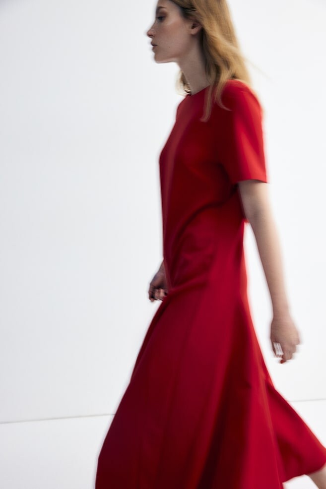 Платье из твила длиной до икры с круглым вырезом и вырезом-капля и потайной пуговицей на шее. Короткие рукава и расклешенная юбка с тканевыми ластовицами для дополнительного объема. Без подкладки. Размер: Спина: Длина: 121,5 см (размер M), Рукав: Длина: 23,5 см (размер M) Длина: миди Длина рукава: Короткий рукав Посадка: Обычный крой Стиль: Расклешенный, Капюшон Вырез: Круглый вырез