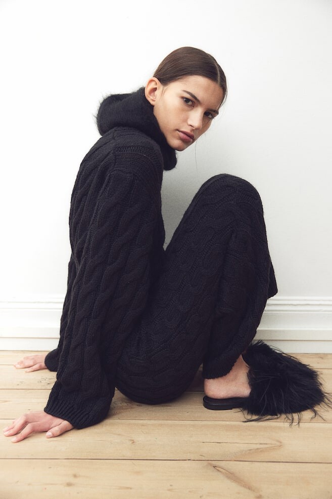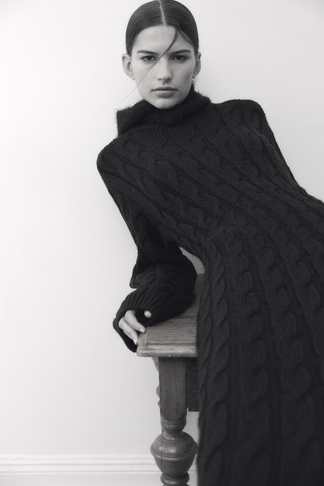 Платье длиной до икры из мягкой косички с круглым вырезом, заниженной линией плеч и длинными рукавами. Вырез, рукава и подол в рубчик.