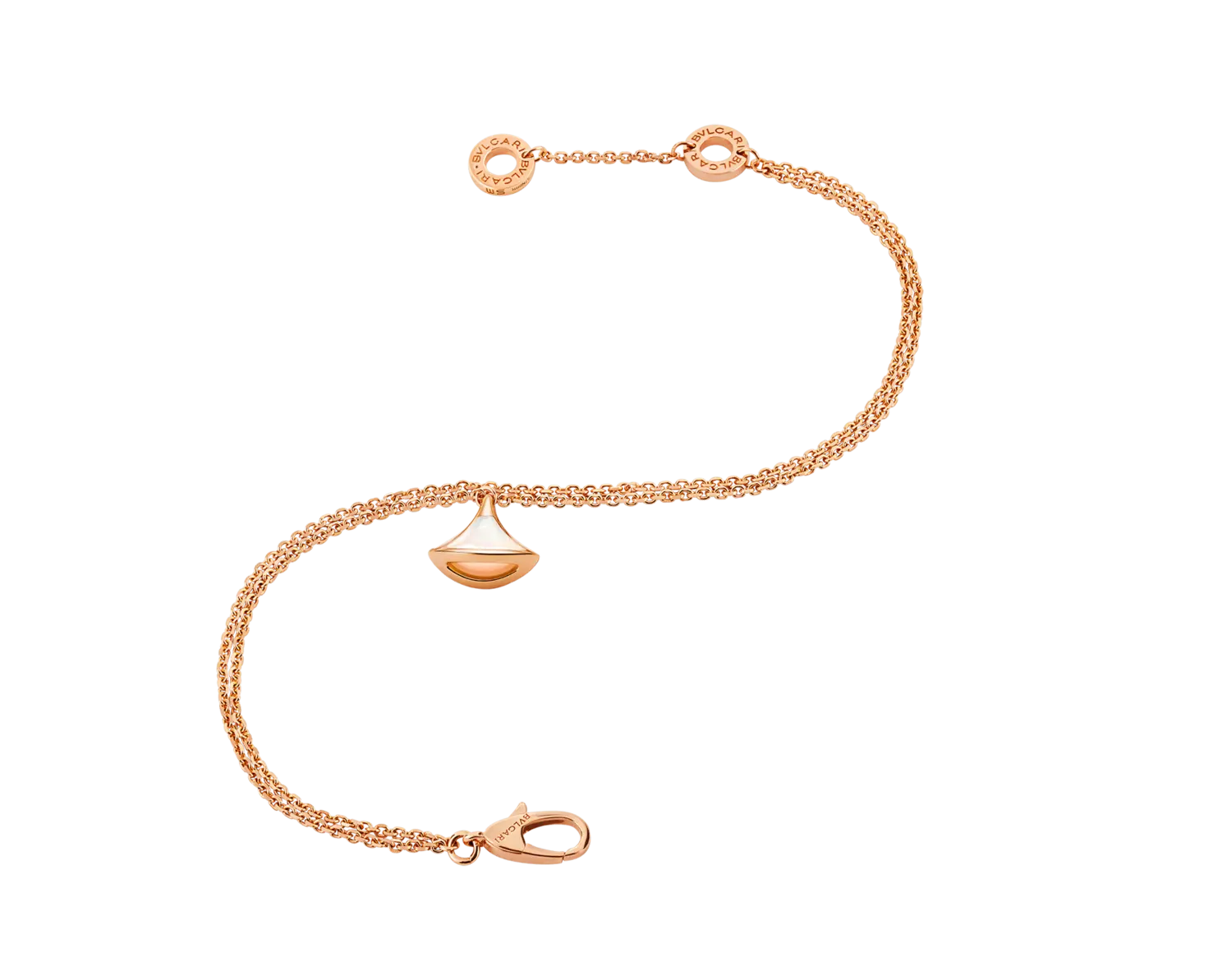 Браслет Divas' Dream из 18-каратного розового золота с подвеской из 18-каратного розового золота с перламутром. Вдохновленный женской элегантностью и очаровательным очарованием вечного города, браслет Divas' Dream отдает дань уважения самым гламурным дивам с безошибочным римским духом. Квинтэссенция женственности и утонченности, браслет скульптурно передает великолепие мрамора терм Каракаллы и чувственные изгибы его веерообразных мозаик, отражая саму суть итальянской красоты.