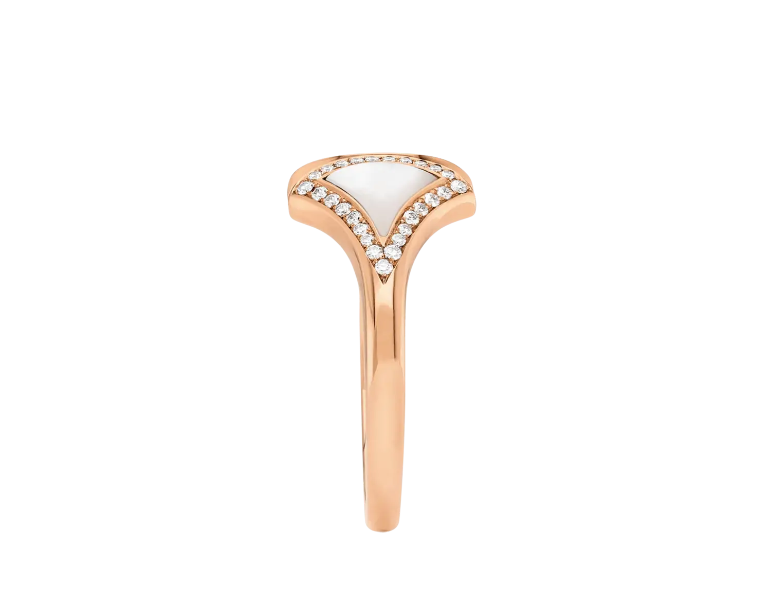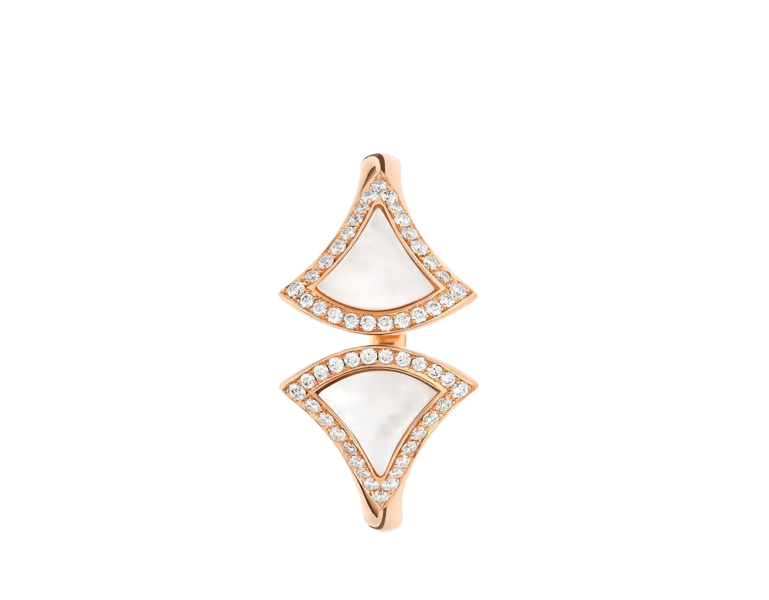 Кольцо Divas' Dream из 18-каратного розового золота с перламутровыми элементами и бриллиантовым паве. Изысканное воплощение итальянского гламура, кольцо Divas' Dream из розового золота 18 карат отдает дань уважения самым очаровательным дивам с характерным римским духом. Вдохновленный женственной элегантностью, его веерообразный мотив создан с использованием перламутровых вставок, обрамленных бриллиантами паве: безошибочная подпись, вызывающая в памяти чувственный узор римской мозаики Каракаллы, в дань вечной красоте.