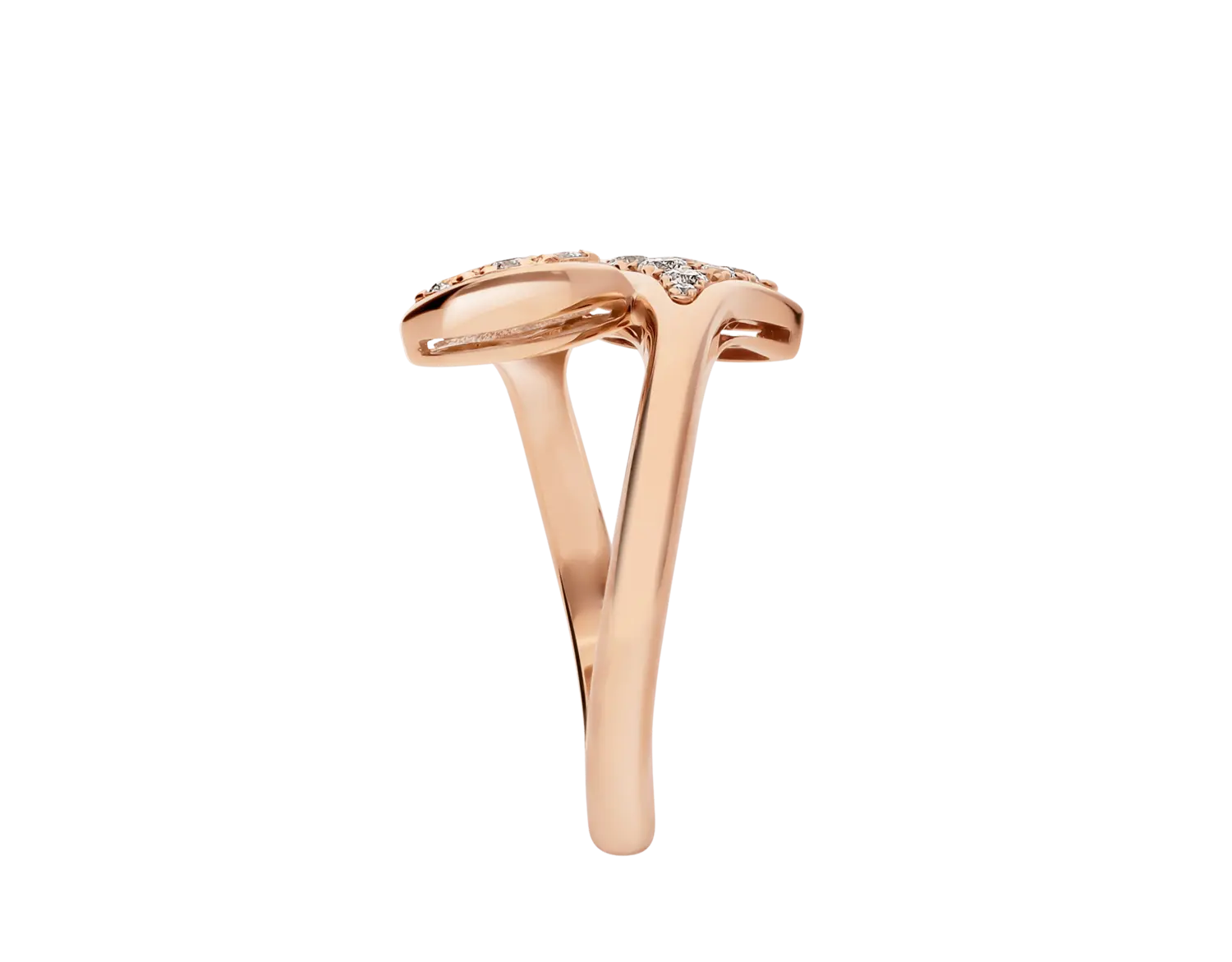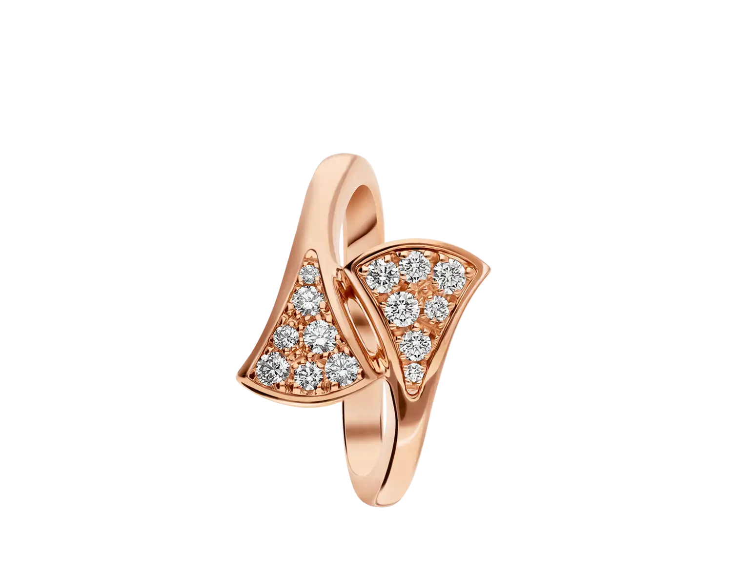 Кольцо Divas' Dream из 18-каратного розового золота с бриллиантовым паве. Кольцо Divas' Dream, воплощающее итальянскую элегантность, представляет легенду о диве с ее таинственным, незабываемым очарованием. Квинтэссенция женственности и утонченности, веерообразный мотив кольца черпает вдохновение из мозаики римских терм Каракаллы, отражая неотъемлемую связь Bvlgari с Вечным городом через современный дизайн и изысканное сочетание драгоценных камней. Кольцо Divas' Dream из розового золота 18 карат с бриллиантовым паве.