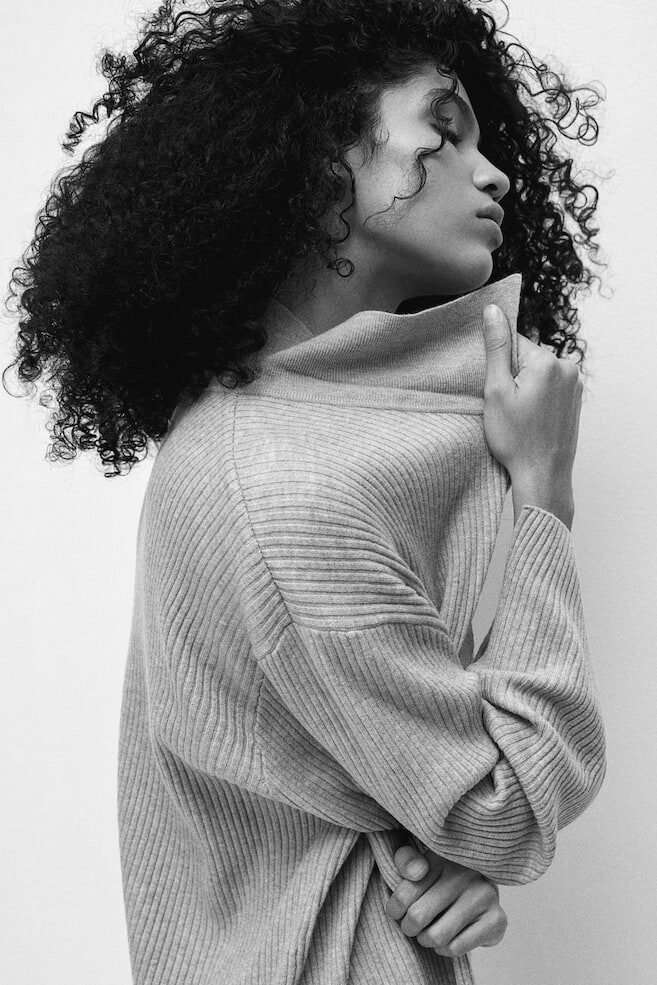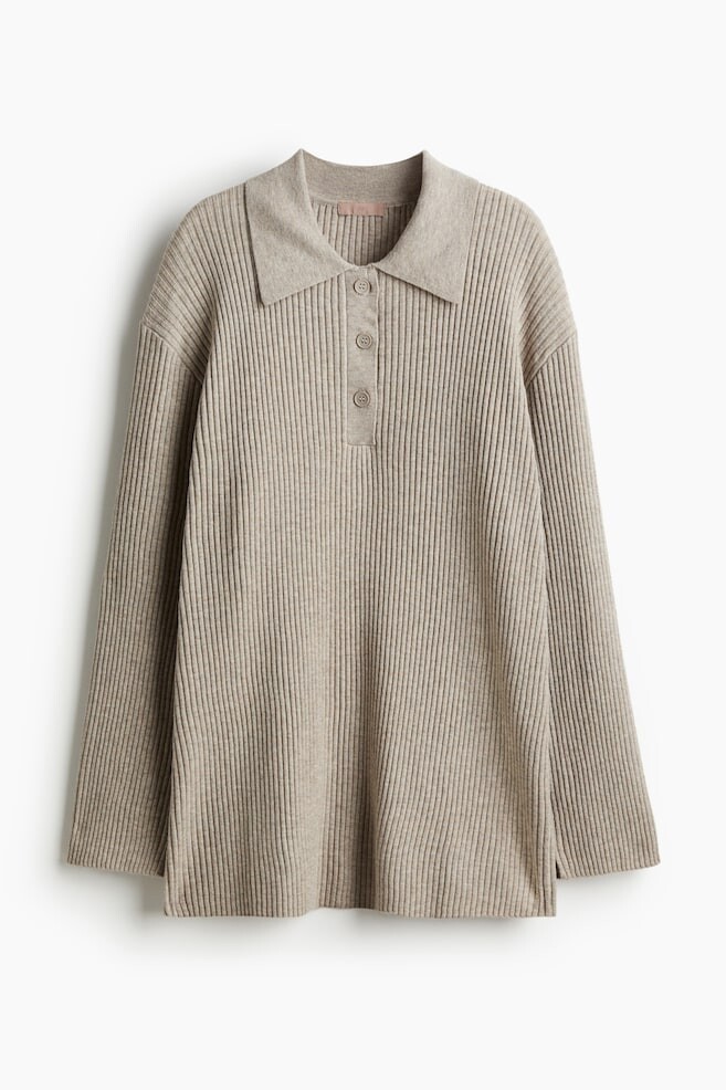 Длинная рубашка-поло свободного кроя из мягкого ребристого трикотажа. С воротником, планкой на пуговицах и длинными рукавами с разрезами. Прямой низ.