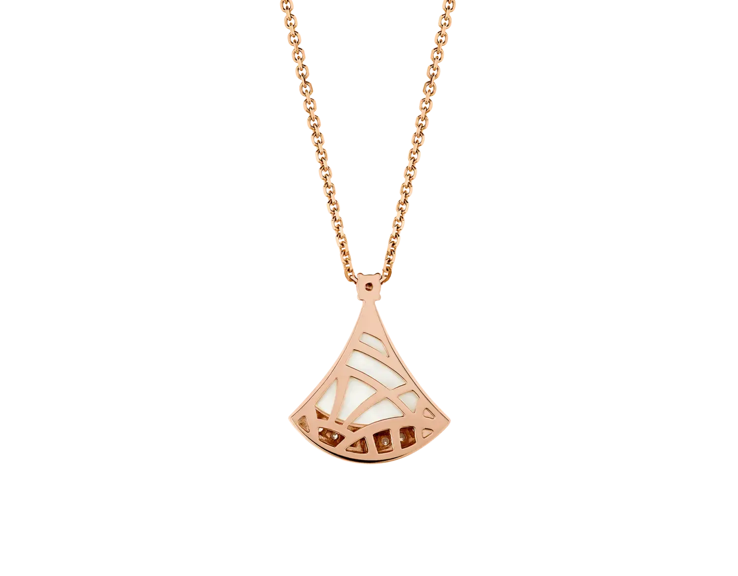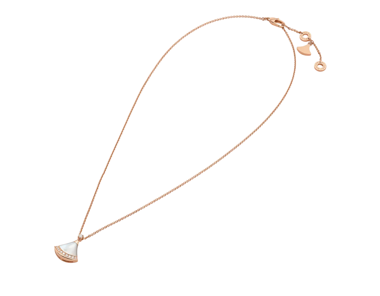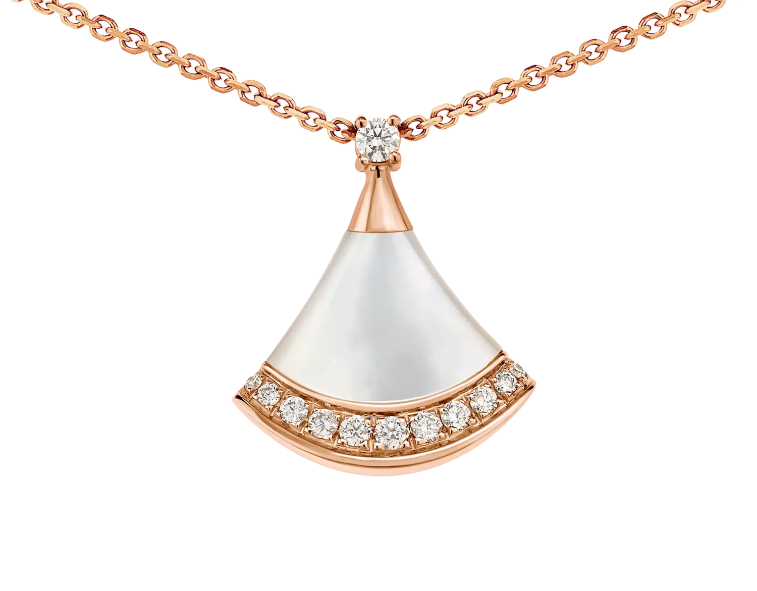 Ожерелье с подвеской Divas' Dream из 18-каратного розового золота с круглым бриллиантом классической огранки (0,03 карата), перламутровым элементом и бриллиантовым паве (0,10 карата). Вдохновленное женской элегантностью и чарующим очарованием Вечного города, ожерелье Divas' Dream отдает дань уважения самым гламурным дивам с безошибочным римским духом. Квинтэссенция женственности и утонченности, ожерелье вылеплено таким образом, чтобы передать великолепие мрамора Терм Каракаллы и чувственные изгибы его веерообразных мозаик, отражая саму суть итальянской красоты.