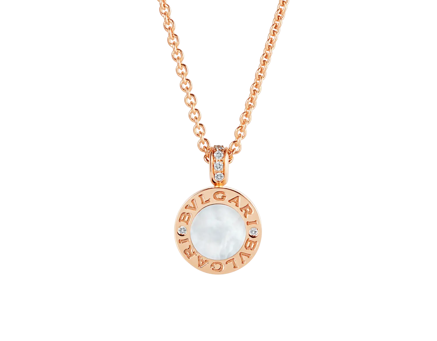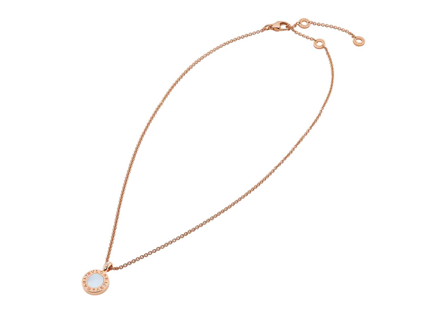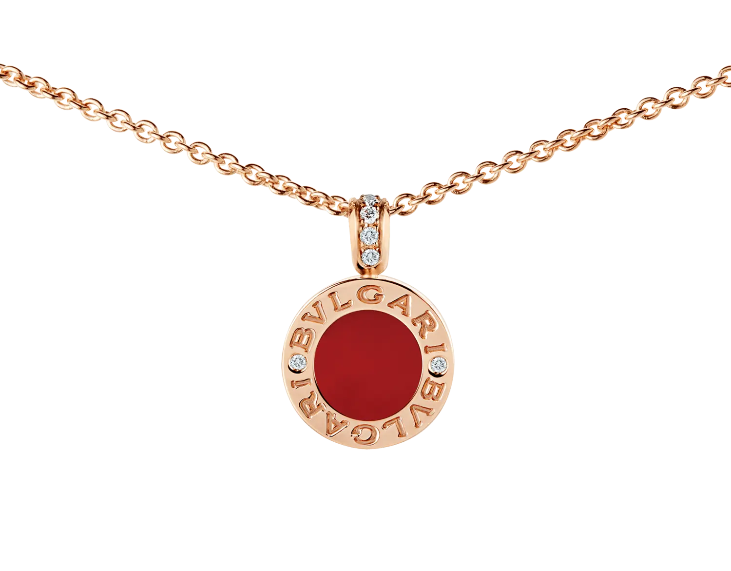 Колье Bvlgari Bvlgari с цепочкой и подвеской из 18-каратного розового золота, украшенными дисками из сердолика и перламутра, а также деталями из бриллиантового паве. С двойной элегантностью колье Bvlgari-Bvlgari раскрывает с помощью круглых вставок из перламутра и сердолика две стороны одной и той же красоты. Выросшая из римских корней бренда в отличительное слияние культуры и современности, коллекция Bvlgari-Bvlgari определяет суть стиля Bvlgari. Напоминая изогнутые надписи на древнеримских монетах, двойной логотип олицетворяет первый случай, когда эмблема стала выдающейся эмблемой ювелирного дизайна, и по сей день является одним из вечных товарных знаков креативности Bvlgari. Подвеска Bvlgari Bvlgari из 18-каратного розового золота с сердоликом, перламутром и бриллиантами паве (0,12 карата).