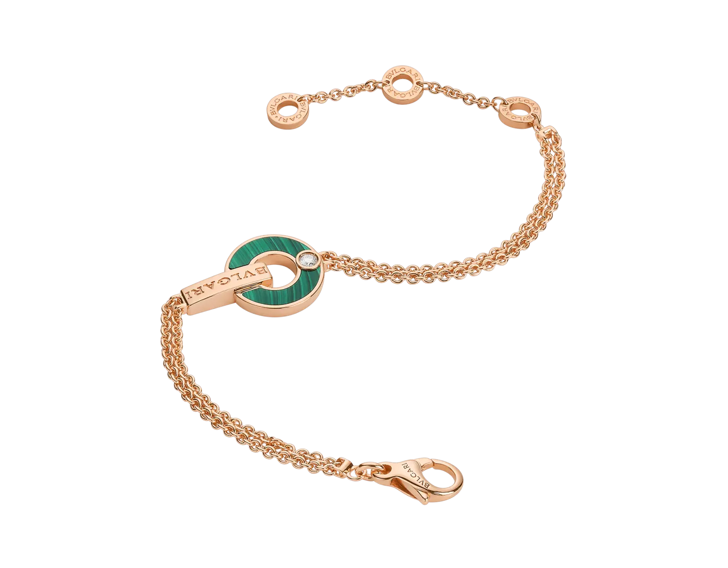 Ажурный браслет Bvlgari Bvlgari из 18-каратного розового золота со вставками из малахита и круглым бриллиантом бриллиантовой огранки.