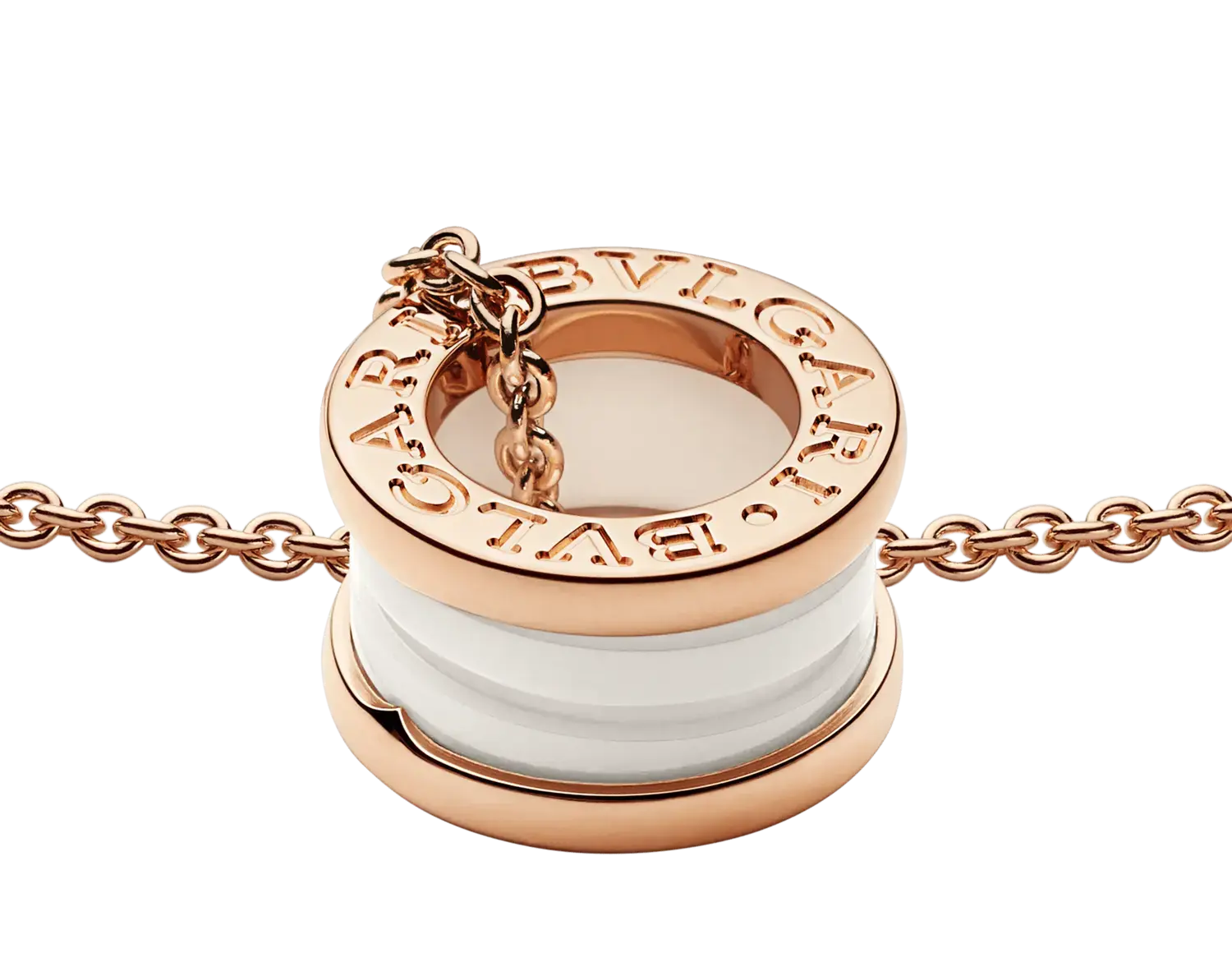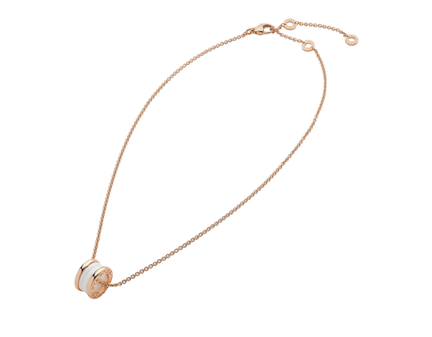 Ожерелье B.zero1 с цепочкой из 18-каратного розового золота и подвеской из 18-каратного розового золота и белой керамики. Черпая вдохновение в самом известном амфитеатре мира, Колизее, колье B.zero1 является истинным выражением творческого видения Bvlgari, бросающим вызов самой сути ювелирного дизайна. Чистота его отличительной спирали является метафорой гармонии прошлого, настоящего и будущего, отраженной в великолепии вечного города, и эмблемой новаторского духа коллекции. Колье B.zero1 с цепочкой из 18-каратного розового золота и подвеской из 18-каратного розового золота и белой керамики. Длина 14,60–17,70 дюймов (38–45 см).