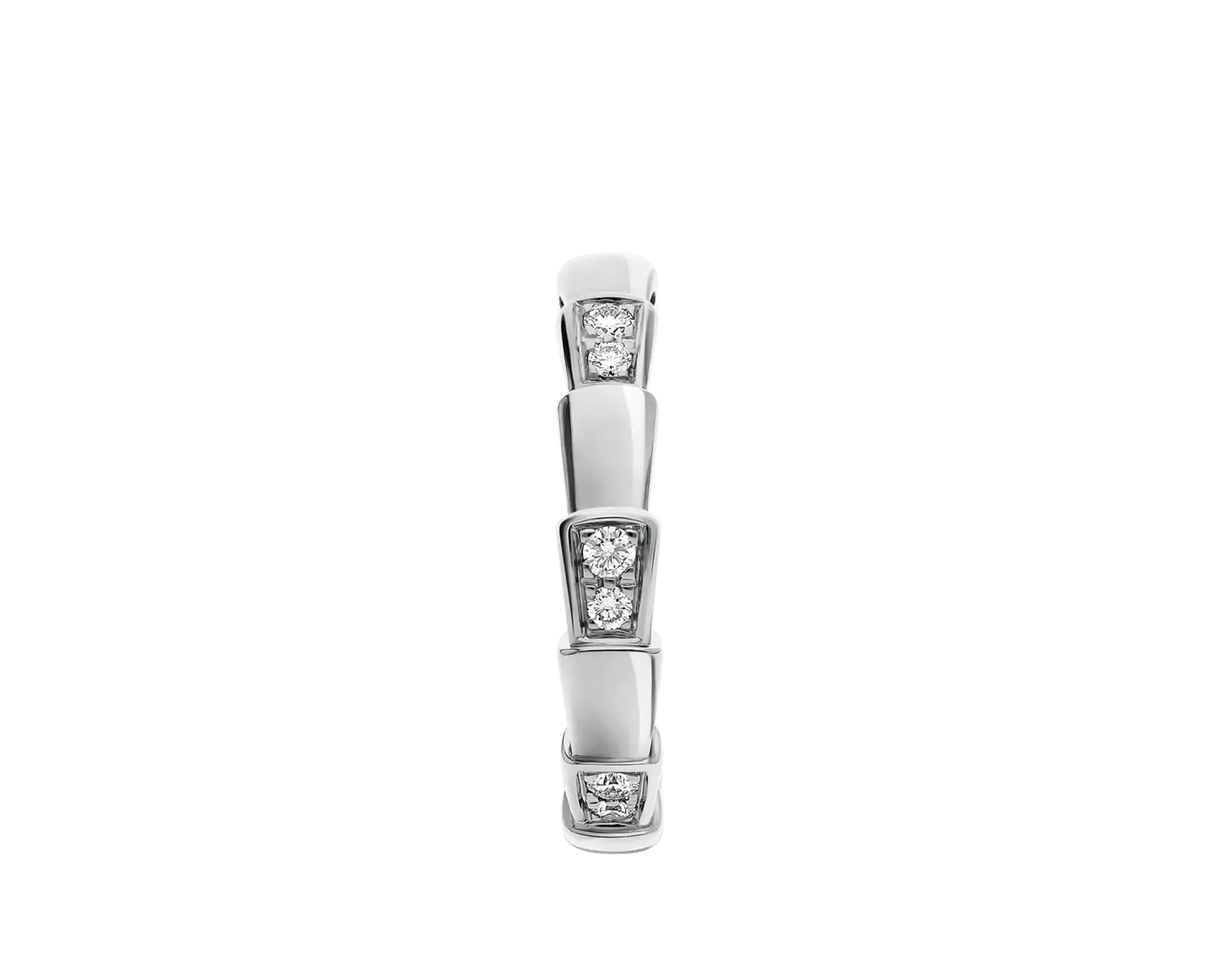 Кольцо Serpenti Viper из 18-каратного белого золота с бриллиантами в технике деми-паве. Кольцо Serpenti Viper из 18-каратного белого золота с бриллиантами demi pavé, фирменное сочетание чистой эстетики, обволакивающих форм и харизматичного стиля, является неотъемлемой интерпретацией символа бесконечных метаморфоз Bvlgari. Отражая мощную и постоянно меняющуюся природу мифического змея, это магнетическое ювелирное творение вдохновляет нас принимать перемены как источник силы и уверенности в себе. Легкое в комбинировании, кольцо предлагает бесконечные возможности для стилизации, воплощая универсальный дух коллекции.