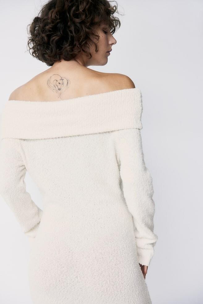 Платье длиной до икры с открытыми плечами из мягкого трикотажа букле, облегающего кроя. С широкой манжетой сверху, длинными рукавами и прямым подолом. Узкие ребристые манжеты и подол.