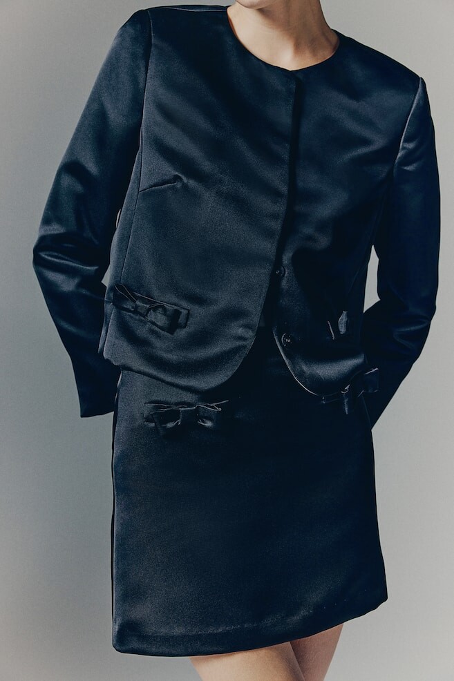 Короткий атласный пиджак с круглым вырезом и потайной планкой на кнопках. На груди вытачки и ложные прорезные карманы с декоративным бантом спереди. Тонкие подплечники и прорезные манжеты. На подкладке. Размер: Рукав: Длина: 60,5 см (размер 40), плечо: ширина: 41,0 см (размер 40), спинка: длина: 48,5 см (размер 40) Длина: короткая Длина рукава Состав: Длинный рукав Посадка: Обычная посадка Стиль: Пиджак, без воротника, однобортный Вырез: Круглый вырез
