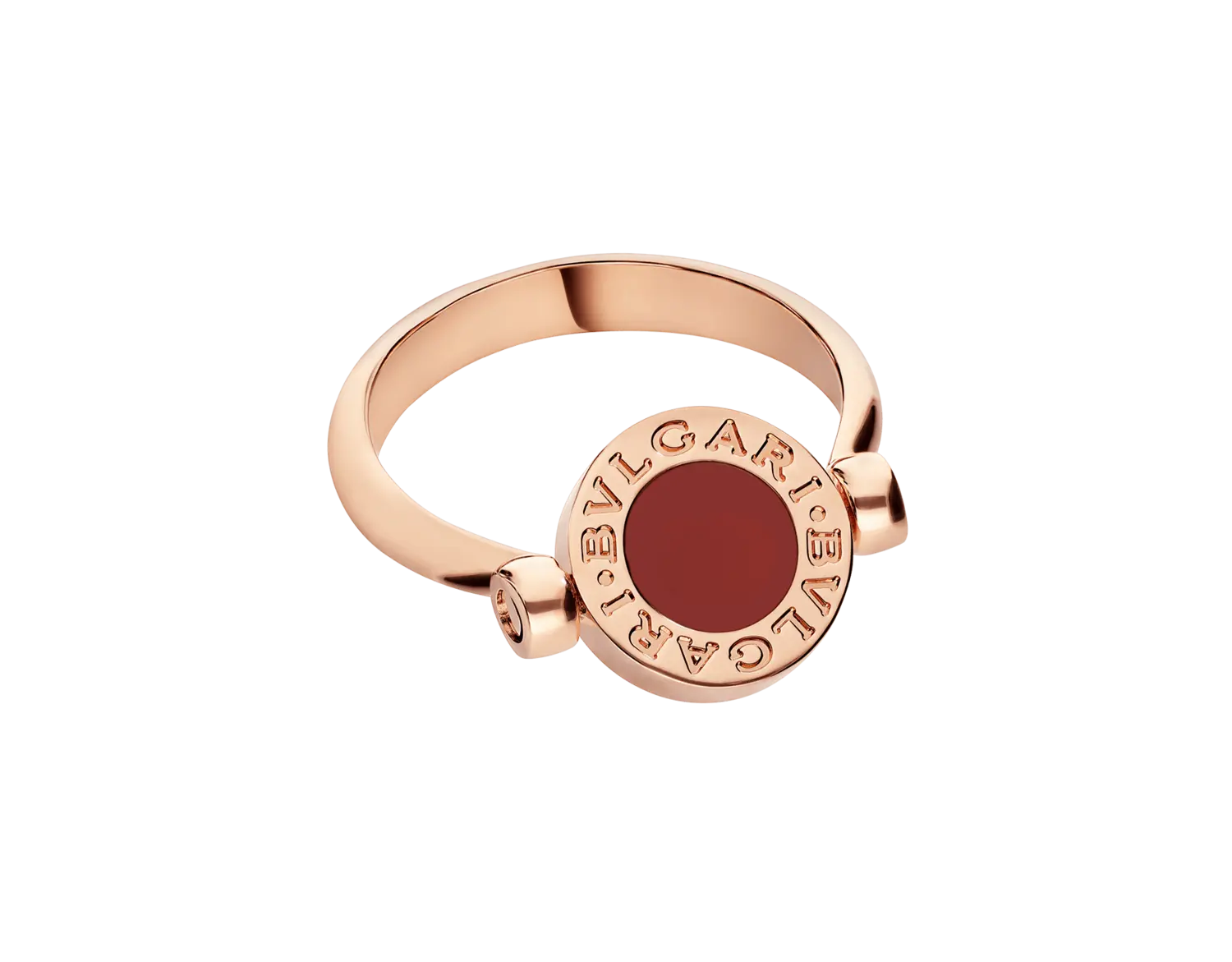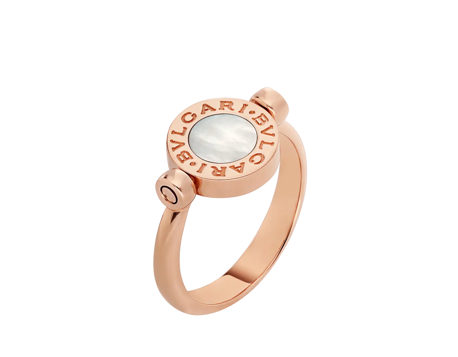 Кольцо-перевертыш Bvlgari Bvlgari из розового золота 18 карат с перламутровыми и сердоликовыми элементами. Кольцо Bvlgari Bvlgari, выросшее из римских корней бренда в элегантное слияние культуры и современности, является ярким, современным заявлением о классике. Фирменный двойной логотип изначально был вдохновлен изогнутыми надписями на древних монетах, а сегодня он превратился в игривые интерпретации, обрамляющие разноцветные твердые драгоценные камни. В соответствии с динамичным духом коллекции, кольцо демонстрирует два разных цветовых варианта в одном украшении. Кольцо-перевертыш Bvlgari Bvlgari из розового золота 18 карат с перламутром и сердоликом.