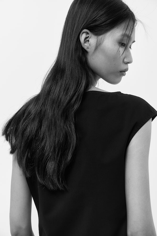 Короткий, облегающий фигуру топ из крепового трикотажа с круглым вырезом и V-образным вырезом с декоративными бантами спереди. Рукава-крылышки и прямой низ с небольшими боковыми разрезами.