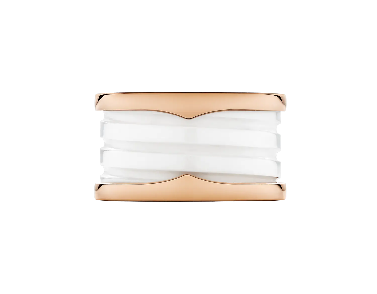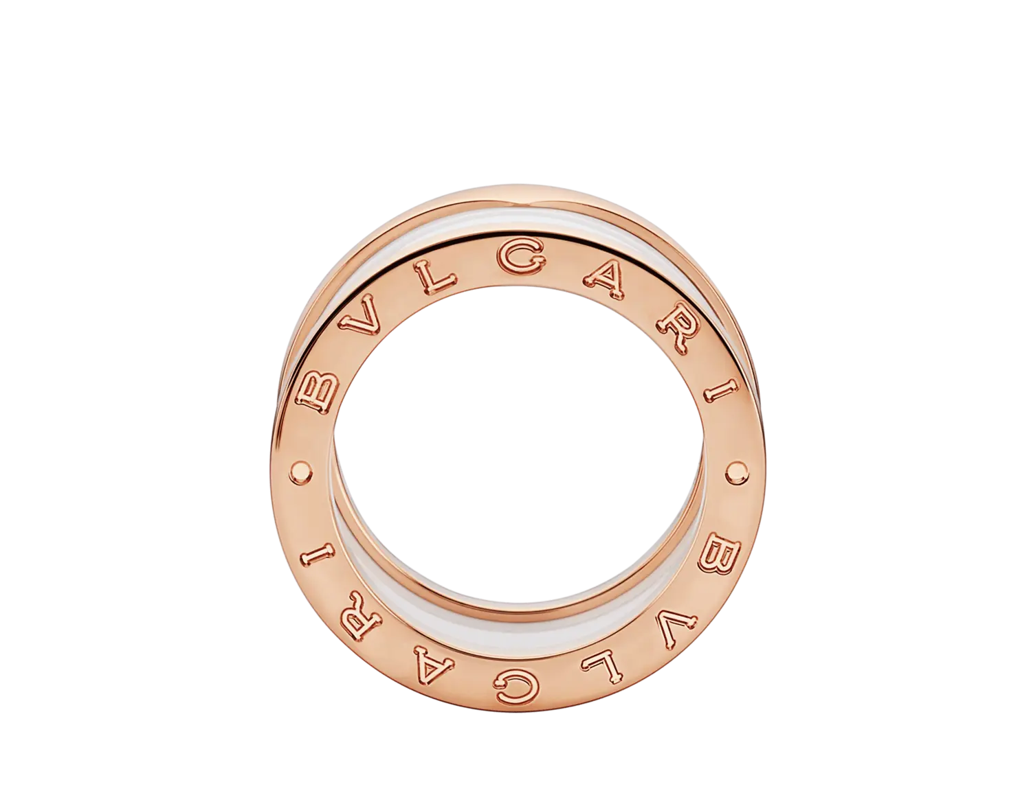 Кольцо B.zero1 с четырьмя полосами, двумя петлями из 18-каратного розового золота и белой керамической спиралью. Черпая вдохновение в самом известном амфитеатре мира, Колизее, кольцо B.zero1 является истинным выражением творческого видения Bvlgari, бросающим вызов самой сути ювелирного дизайна. Чистота его отличительной спирали является метафорой гармонии прошлого, настоящего и будущего, отраженной в великолепии вечного города, и эмблемой новаторского духа коллекции. Четырехполосное кольцо B.zero1 с двумя петлями из 18-каратного розового золота и белой керамической спиралью.