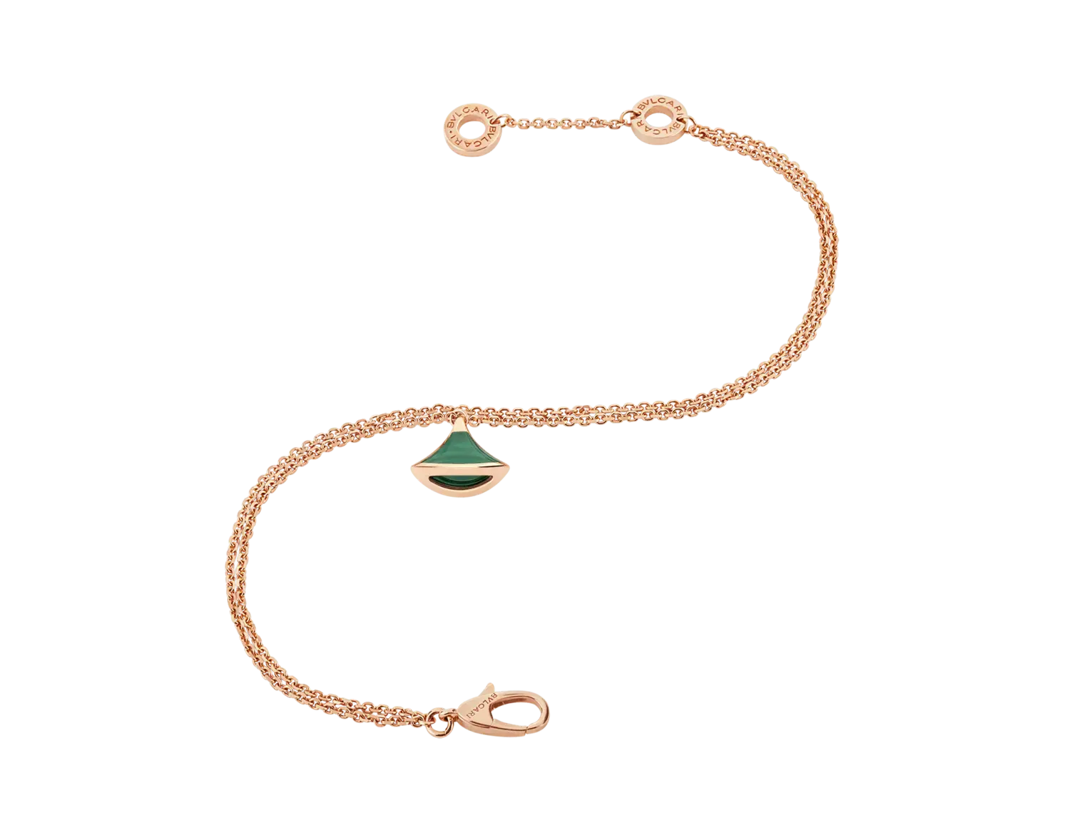 Браслет Divas' Dream из розового золота 18 карат с малахитовой вставкой. Вдохновленный женской элегантностью и очаровательным очарованием Вечного города, браслет Divas' Dream отдает дань уважения самой гламурной из див с безошибочным римским духом. Квинтэссенция женственности и утонченности, браслет создан, чтобы передать великолепие римских терм Каракаллы и чувственные изгибы их веерообразных мозаик, отражающих саму суть итальянской красоты.