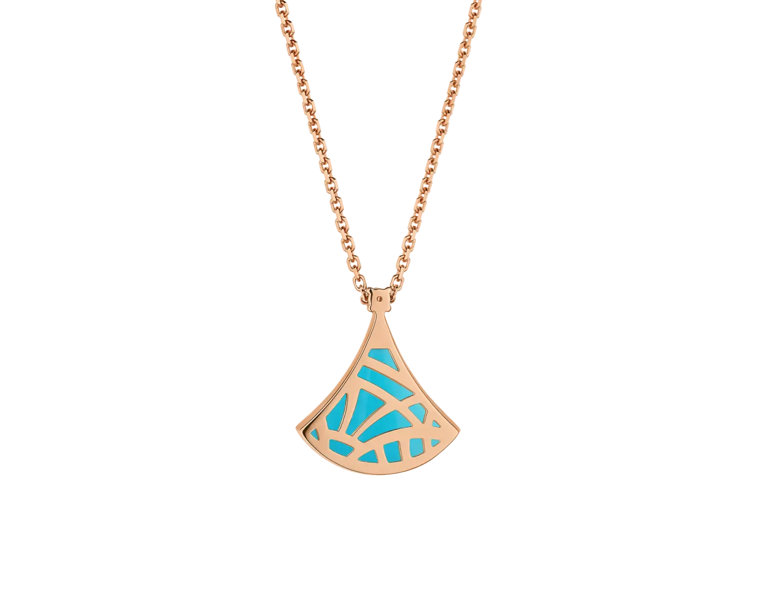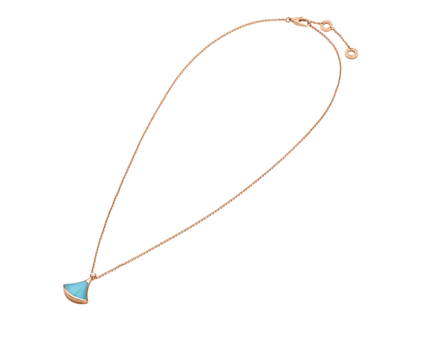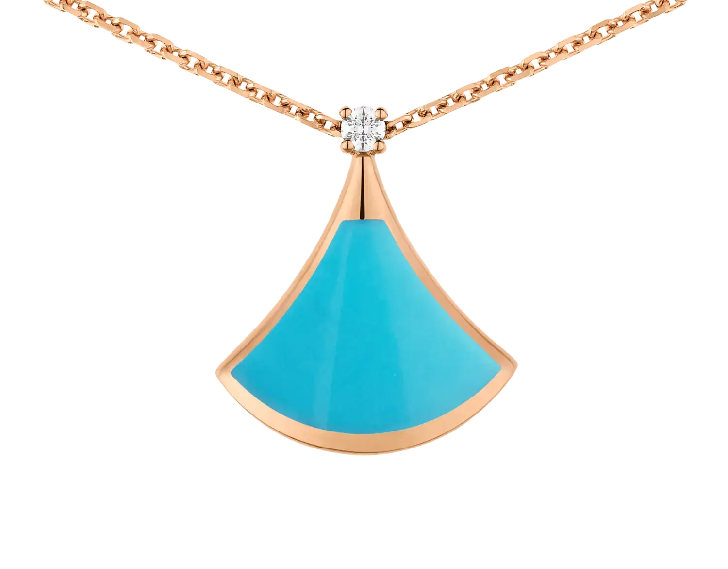 Колье Divas' Dream из 18-каратного розового золота с подвеской, украшенной бирюзой и одним бриллиантом. Вдохновленное женской элегантностью и очаровательным очарованием Вечного города, ожерелье Divas' Dream отдает дань уважения самым гламурным дивам с безошибочным римским духом. Квинтэссенция женственности и утонченности, ожерелье вылеплено таким образом, чтобы передать великолепие мрамора Терм Каракаллы и чувственные изгибы его веерообразных мозаик, отражающих саму суть итальянской красоты.