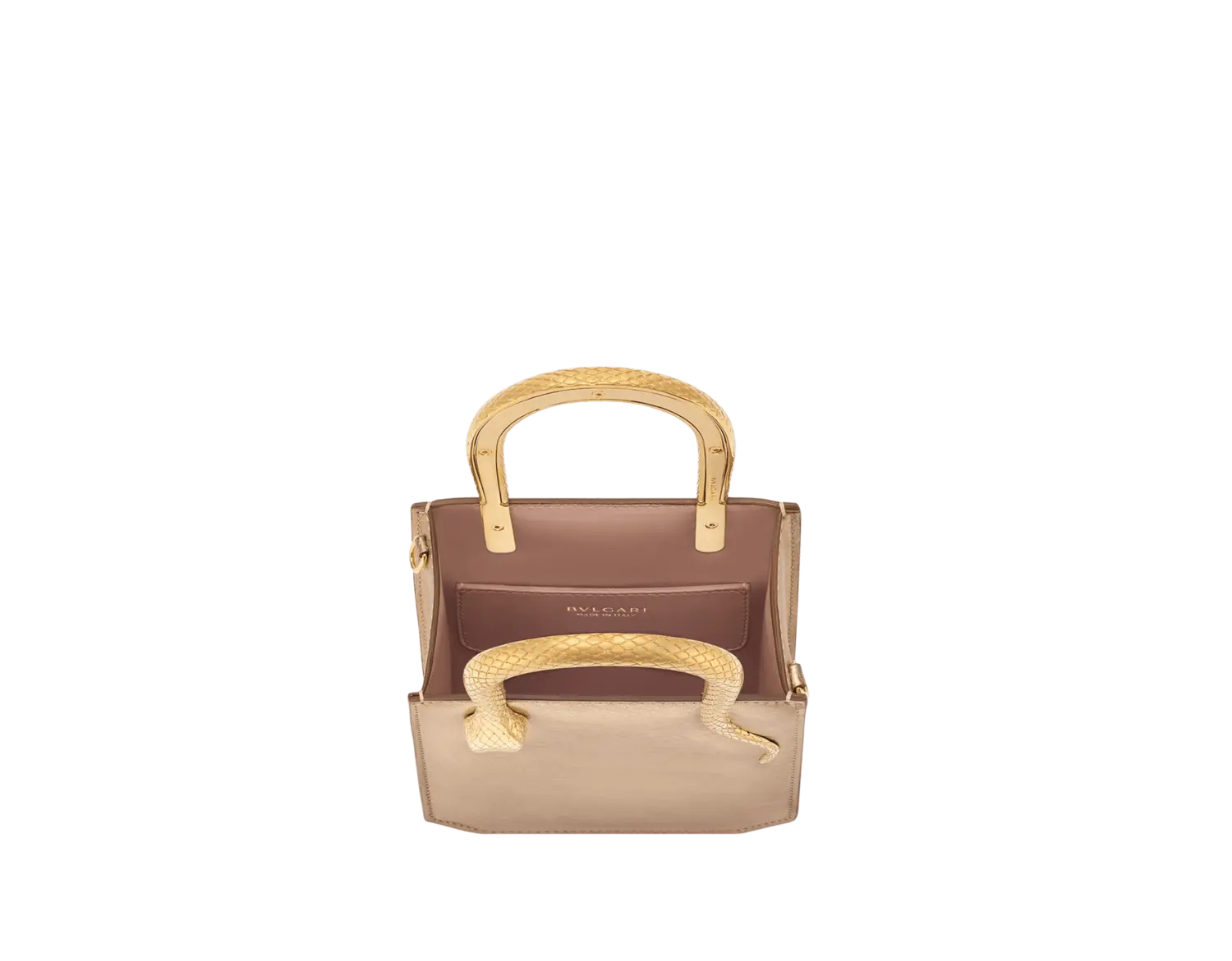 Мини-сумка Serpentine из светло-золотой телячьей кожи с полосками и подкладкой из кожи наппа цвета кристальной розы. Очаровательные ручки в форме змеиного тела из позолоченной латуни, украшенные гравированными чешуйками и красными эмалевыми глазами. Сочетание очень структурированного вертикального корпуса и деталей, вдохновленных ювелирными изделиями, вызывающих в памяти извилистые движения змеи, мини-сумка Serpentine выполнена из светло-золотой телячьей кожи Strated, с металлическим и полосатым эффектом, напоминающим прекрасные включения необработанных алмазов. С двумя ручками в форме змеиного тела, украшенными гравированными чешуйками и красными эмалевыми глазами, дизайн которых черпает вдохновение в смелых исторических ожерельях Serpenti 1960-х годов, эта трендовая модель дополнена одним открытым отделением, кожаным ремешком и внутренним накладным карманом. 13 x 17,5 x 5,5 см - 5,1 x 6,9 x 2,2 дюйма. Сделано в Италии.