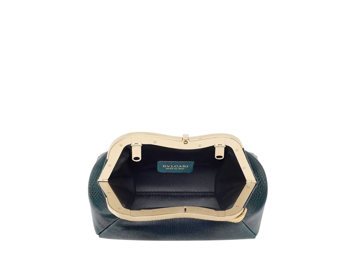 Мастерски изготовленная вручную из блестящей кожи карунга цвета лесного изумруда, маленькая сумочка Serpentine может похвастаться глянцевой, но естественной отделкой. Смелая переосмысленная версия вневременной иконы, сумка сочетает в себе модную форму с ювелирными деталями, вызывающими в памяти извилистые движения змеи. Сумка с каркасом в форме тела змеи, вдохновленная смелыми ожерельями Serpenti 1960-х годов, предлагает несколько стилей в одном, так как ее изогнутый металлический верх украшен гравированными чешуйками и красными эмалевыми глазами спереди для гламурного образа и вставкой из кожи карунга сзади для более непринужденного ощущения. Модель дополняется одним отделением, застежкой на кнопку, кожаным ремешком и металлическим логотипом Bvlgari сзади. 19,5 x 14 x 10 см - 7,7 x 5,5 x 3,9 дюйма. Сделано в Италии.