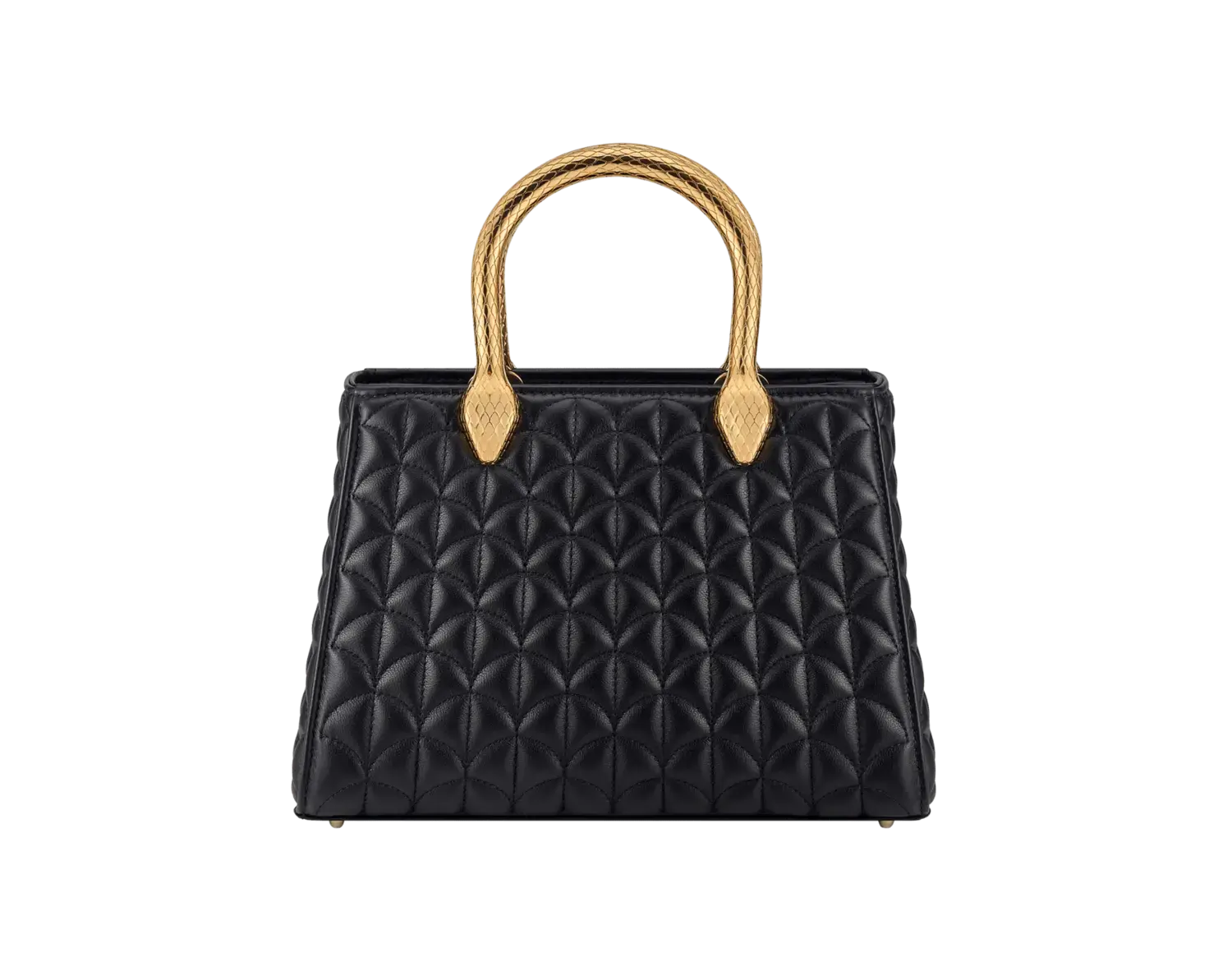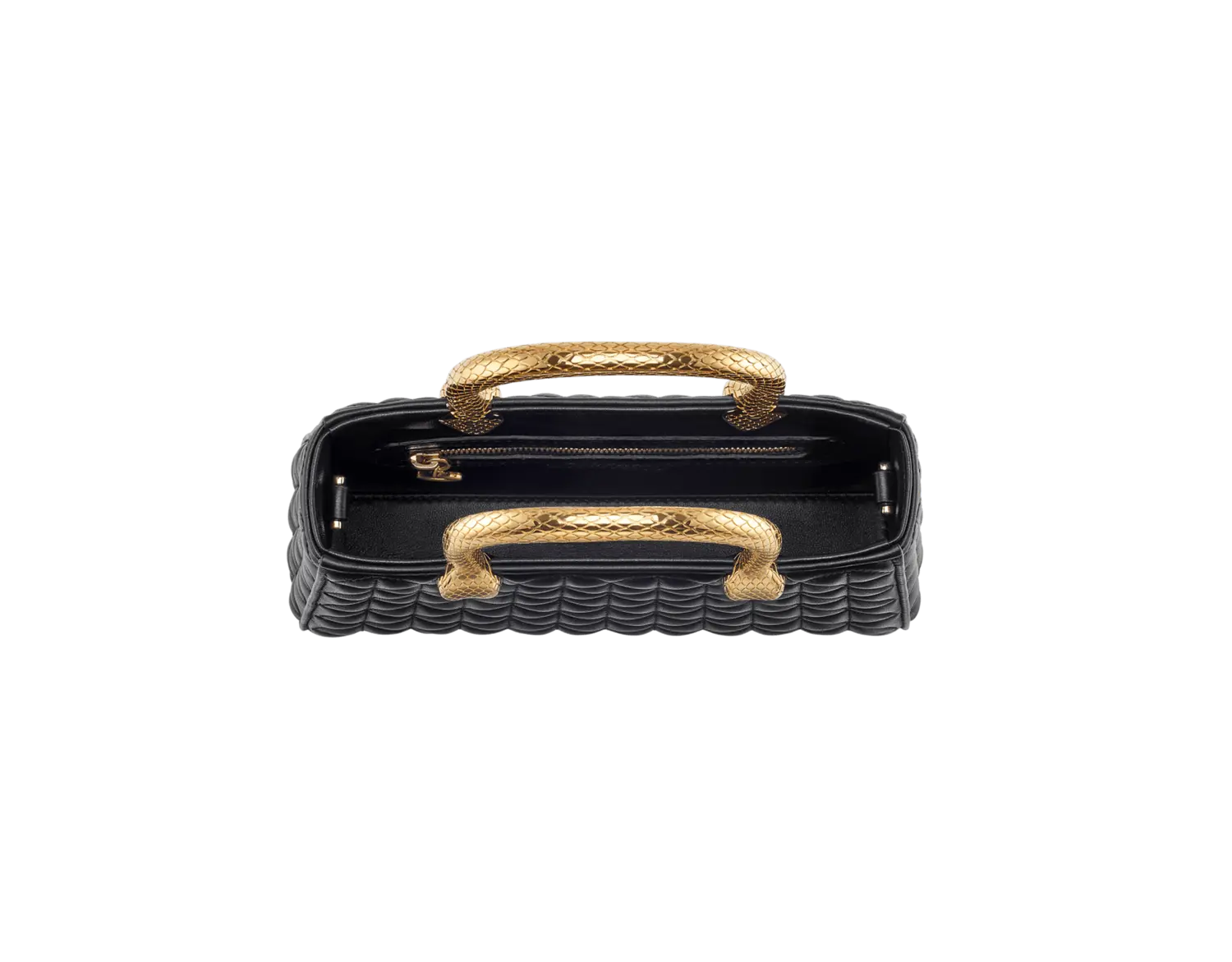 Сумка-тоут Serpentine Duo из черной телячьей кожи с характерным мотивом Calla Matelassé и подкладкой из черной кожи наппа. Очаровательные ручки в форме тела змеи с двумя головками из позолоченной латуни, украшенные выгравированными чешуйками. Сумка-тоут Serpentine Duo, излучающая изысканную привлекательность, сочетает в себе детали, вдохновленные ювелирными изделиями, вызывая в памяти извилистые движения змеи, с исключительным мастерством и римским вдохновением. Изготовленная из черной телячьей кожи, украшенной мотивом Calla Matelassé, эта вечерняя сумка-тоут может похвастаться стеганым узором, навеянным веерообразными полихромными мозаиками Терм Каракаллы, источником вдохновения для ювелирной линии Divas' Dream. Модель оснащена двумя ручками в форме змеиного тела, украшенными гравированными чешуйками, дизайн которых черпает вдохновение в смелых часах Serpenti Bvlgari 1960-х годов, а также кожаным ремешком, одним открытым отделением, внутренним плоским карманом и карманом на молнии. 21,5 x 15 x 6 см - 8,5 x 5,9 x 2,4 дюйма. Сделано в Италии.