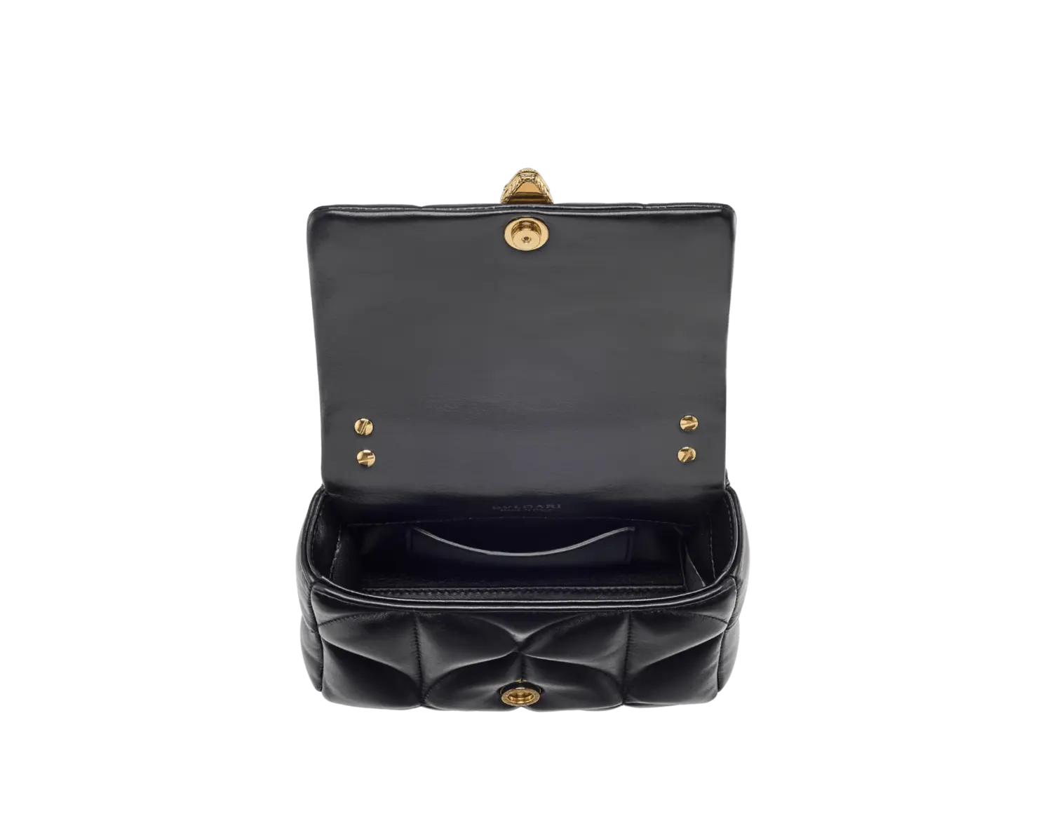 Маленькая сумка через плечо Serpenti Sugarloaf из черной телячьей кожи с крупным мотивом Calla Matelassé и подкладкой из черной кожи наппа. Очаровательная магнитная застежка в виде змеиной головы из позолоченной латуни, украшенная красными эмалевыми глазами. Изысканная и абсолютно универсальная, маленькая сумка через плечо Serpenti Sugarloaf сочетает в себе римское вдохновение с исключительным мастерством и современным стилем. Изготовленная из черной телячьей кожи с характерным мотивом Calla Matelassé, эта удобная в носке модель может похвастаться макси-стеганым рисунком, напоминающим как высококупольный вариант фирменной огранки кабошон Bvlgari, так и веерообразный мотив, характерный для мозаики Терм Каракаллы, источника вдохновения для ювелирной линии Divas' Dream. Сумка дополнена традиционной магнитной застежкой в виде змеиной головы, которая черпает вдохновение из часов Bvlgari 1960-х годов, и оснащена несъемной кожаной ручкой и съемным цепочным ремешком Gourmette. Модель с одним отделением дополнена внутренним плоским карманом. 16 x 12 x 6 см - 6,3 x 4,7 x 2,4 дюйма. Сделано в Италии.