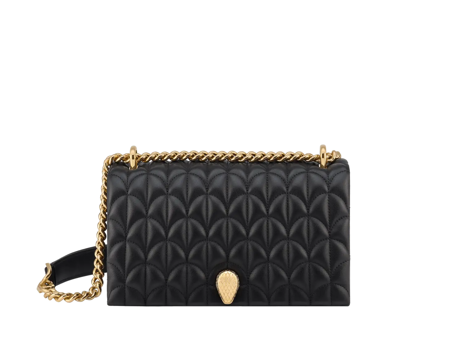Сумка через плечо Serpenti Sugarloaf из черной телячьей кожи с характерным мотивом Calla Matelassé и подкладкой из черной кожи наппа. Очаровательная магнитная застежка в виде змеиной головы из позолоченной латуни, украшенная красными эмалевыми глазами. Изысканная и абсолютно универсальная, сумка через плечо Serpenti Sugarloaf сочетает в себе римское вдохновение с исключительным мастерством и современным стилем. Изготовленная из черной телячьей кожи с характерным мотивом Calla Matelassé, эта удобная в носке модель может похвастаться стеганым узором, напоминающим как высококупольный вариант фирменной огранки кабошон Bvlgari, так и веерообразный мотив, характерный для мозаики Терм Каракаллы, источника вдохновения для ювелирной линии Divas' Dream. Сумка дополнена исторической магнитной застежкой в виде змеиной головы, которая черпает вдохновение из часов Bvlgari 1960-х годов, и оснащена раздвижным цепочным ремешком Gourmette, представляющим собой кожаную вставку, которую можно прикрепить непосредственно к сумке как верхнюю ручку. Модель с двумя отделениями дополнена внутренним карманом на молнии. 21 x 12,5 x 9 см - 8,3 x 4,9 x 3,5 дюйма. Сделано в Италии.