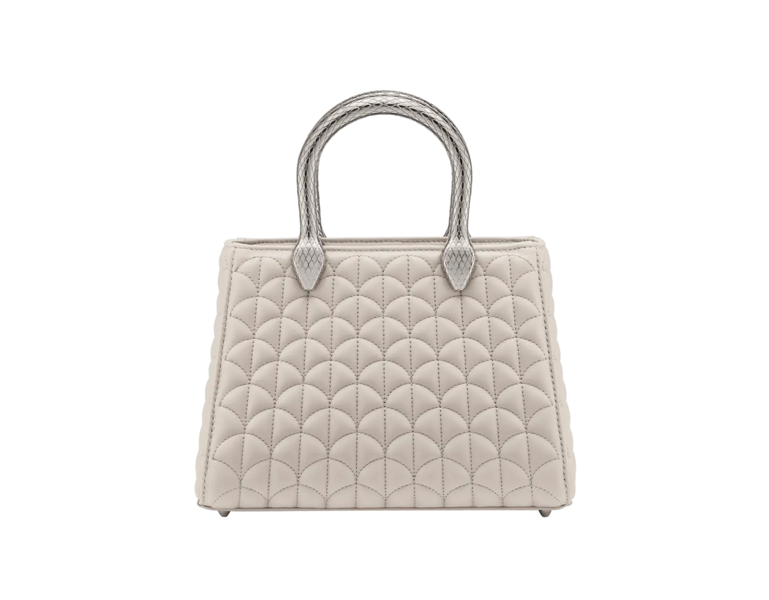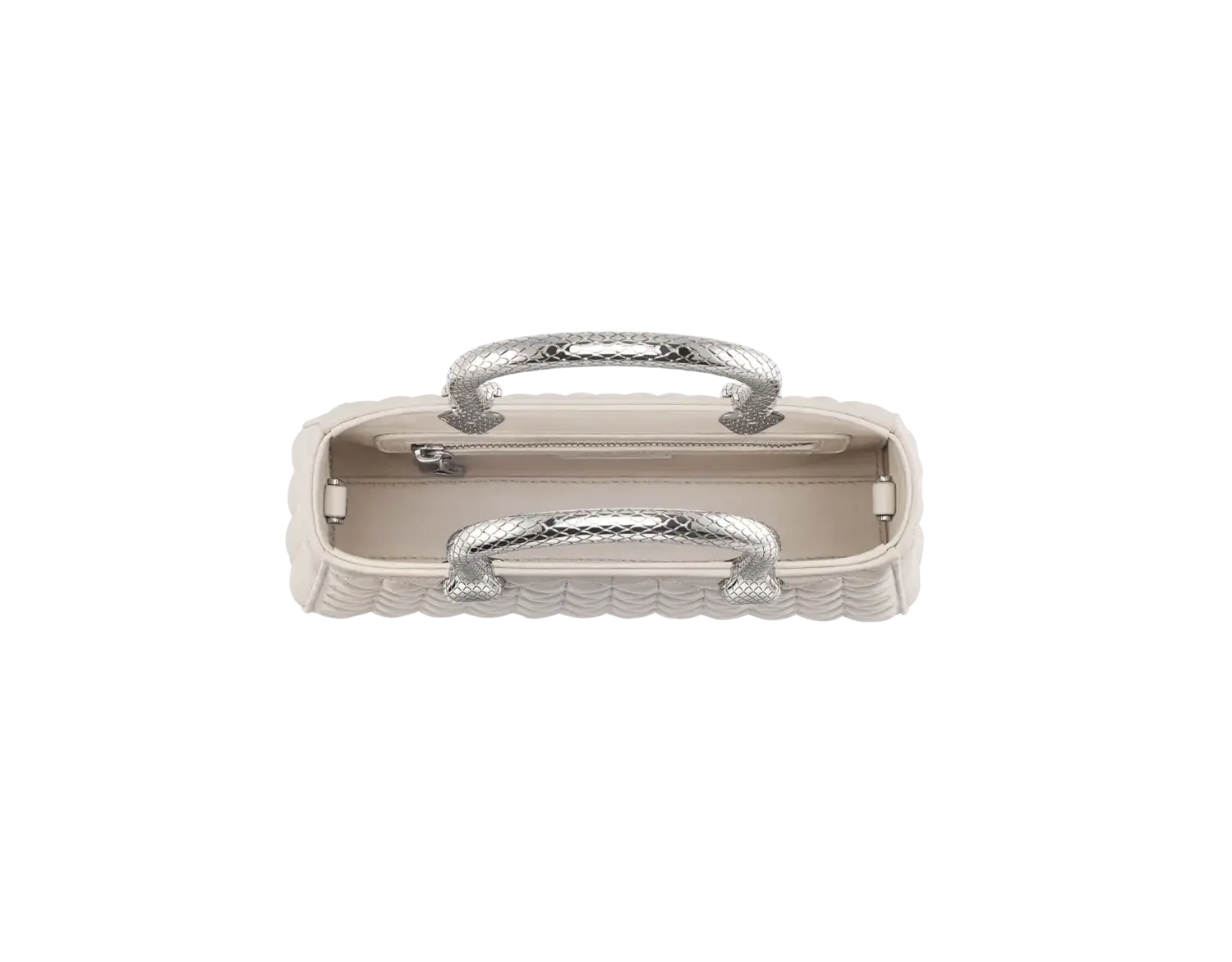 Сумка-тоут Serpentine Duo из белой агатовой телячьей кожи с характерным мотивом Calla Matelassé и подкладкой из белой агатовой кожи наппа. Очаровательные ручки в форме тела змеи с двумя головками из палладиевой латуни, украшенные гравированными чешуйками. Сумка-тоут Serpentine Duo, излучающая изысканную привлекательность, сочетает в себе детали, вдохновленные ювелирными изделиями, вызывающие в памяти извилистые движения змеи, с исключительным мастерством и римским вдохновением. Изготовленная из белой телячьей кожи агата, отмеченной мотивом Calla Matelassé, эта вечерняя сумка-тоут может похвастаться стеганым узором, навеянным веерообразными полихромными мозаиками Терм Каракаллы, источником вдохновения для ювелирной линии Divas' Dream. Модель оснащена двумя ручками в форме змеиного тела, украшенными гравированными чешуйками, дизайн которых черпает вдохновение в смелых часах Serpenti Bvlgari 1960-х годов, а также кожаным ремешком, одним открытым отделением, внутренним плоским карманом и карманом на молнии. 21,5 x 15 x 6 см - 8,5 x 5,9 x 2,4 дюйма. Сделано в Италии.