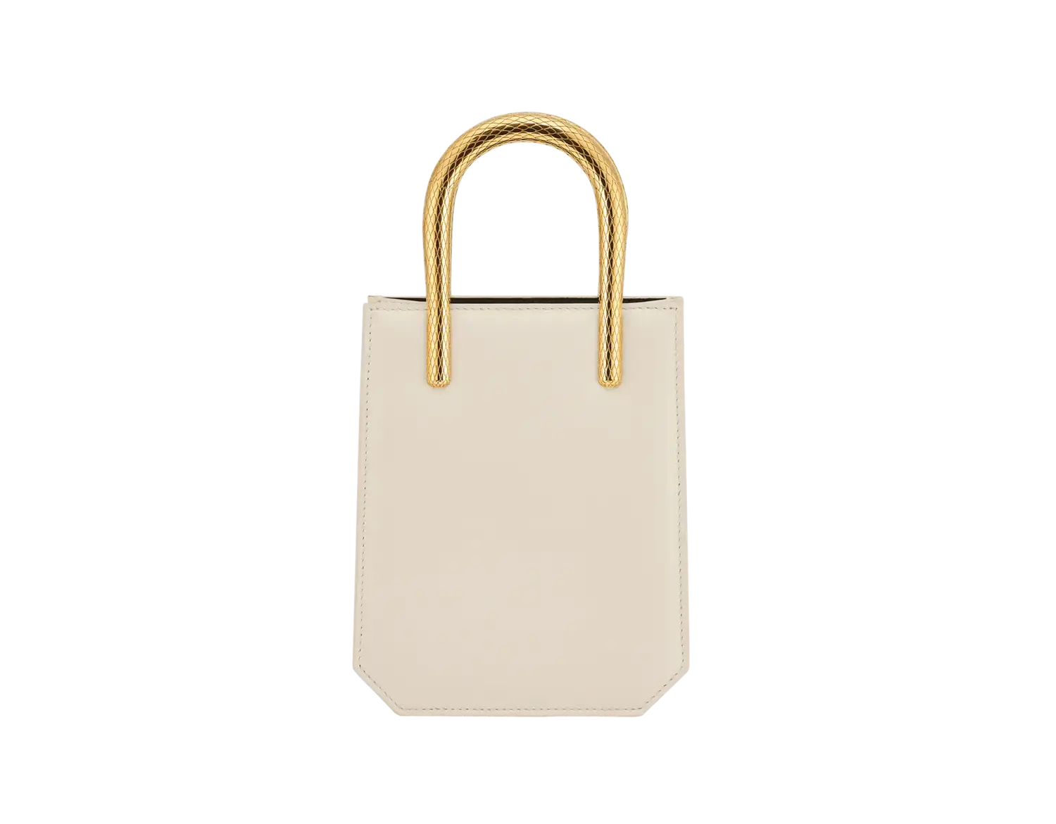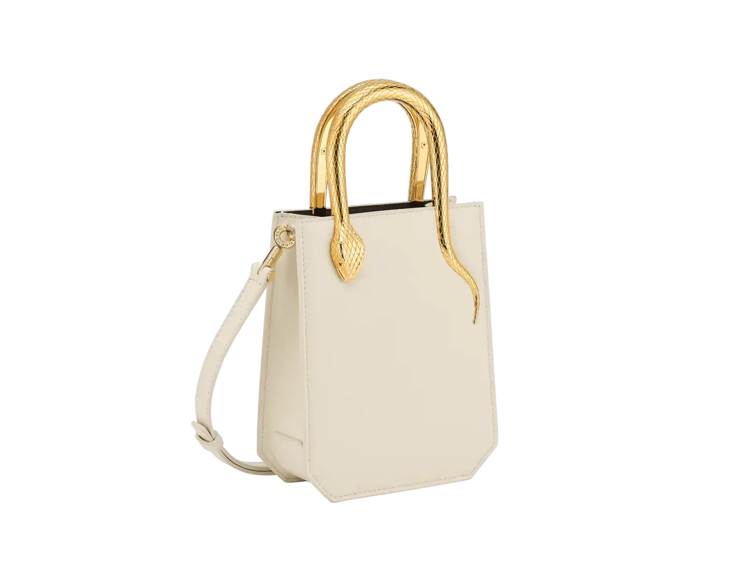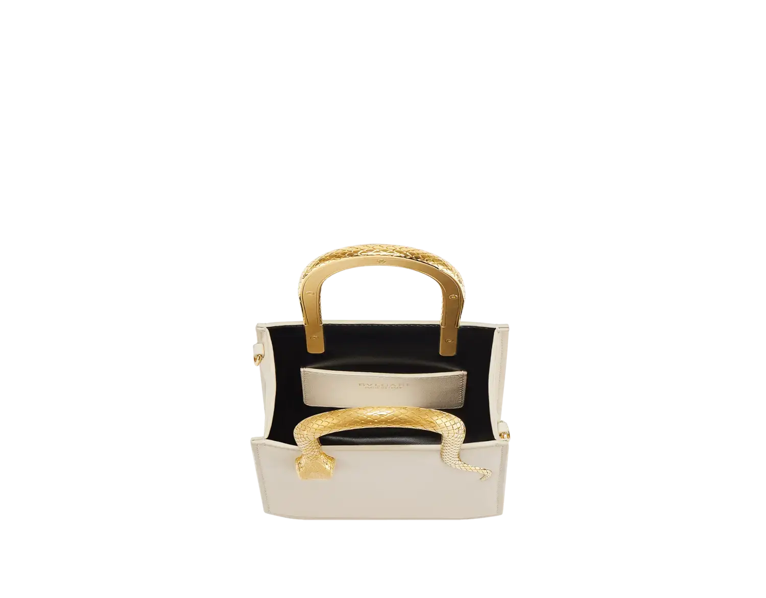 Мини-сумка-тоут Serpentine из телячьей кожи Metropolitan цвета слоновой кости и опала с подкладкой из черной кожи наппа. Очаровательные ручки в форме змеиного тела из позолоченной латуни, украшенные гравированными чешуйками и красными эмалевыми глазами. Сумка-тоут Serpentine mini, сочетающая в себе очень структурированный вертикальный корпус с деталями, вдохновленными ювелирными изделиями, вызывающими извилистые движения змеи, изготовлена из прочной, но мягкой телячьей кожи Metropolitan цвета слоновой кости и опала. С двумя ручками в форме змеиного тела, украшенными гравированными чешуйками и красными эмалевыми глазами, дизайн которых черпает вдохновение в смелых исторических ожерельях Serpenti 1960-х годов, эта модная сумка дополнена одним открытым отделением, кожаным ремешком и внутренним накладным карманом. 13 x 17,5 x 5,5 см - 5,1 x 6,9 x 2,2". Сделано в Италии.