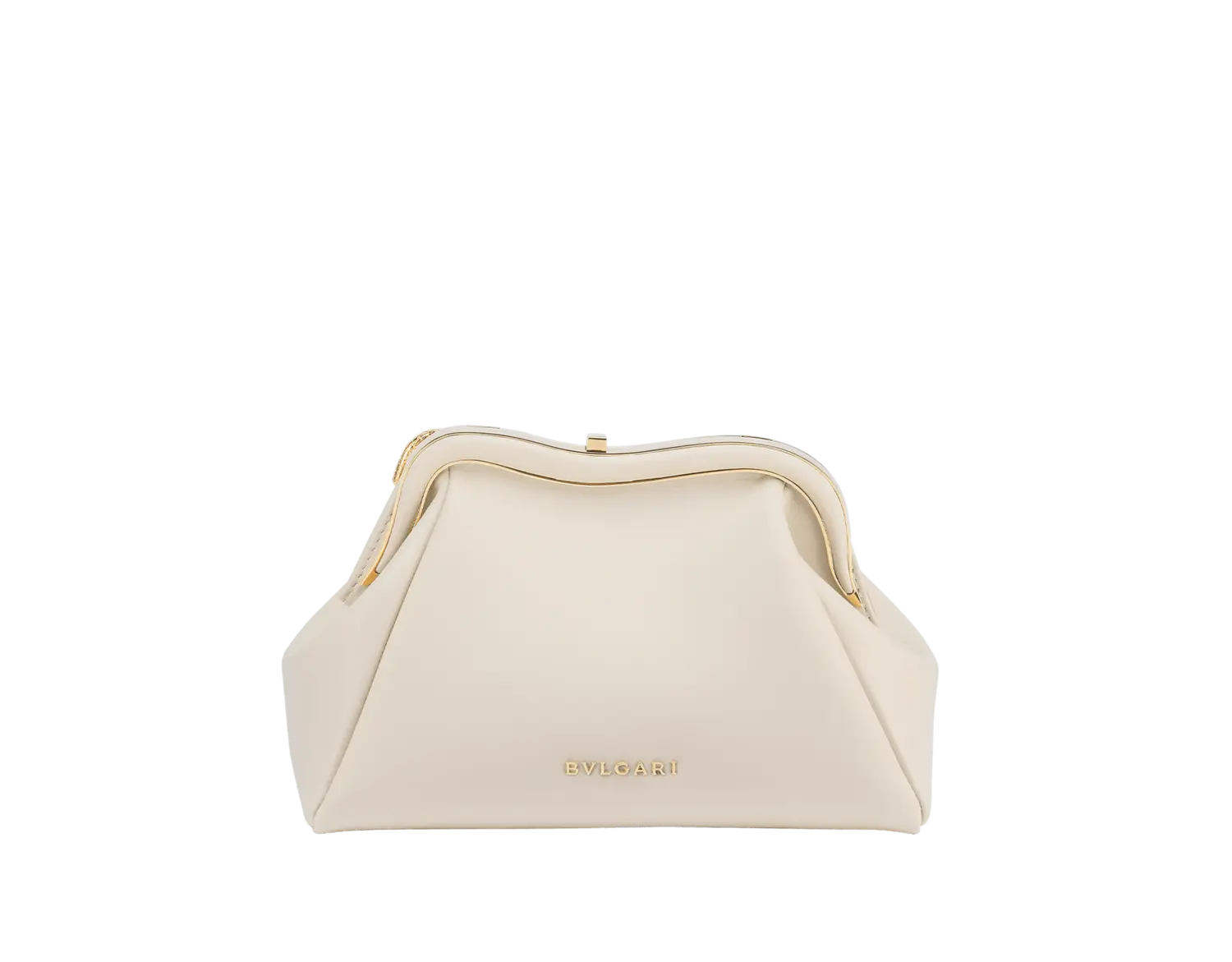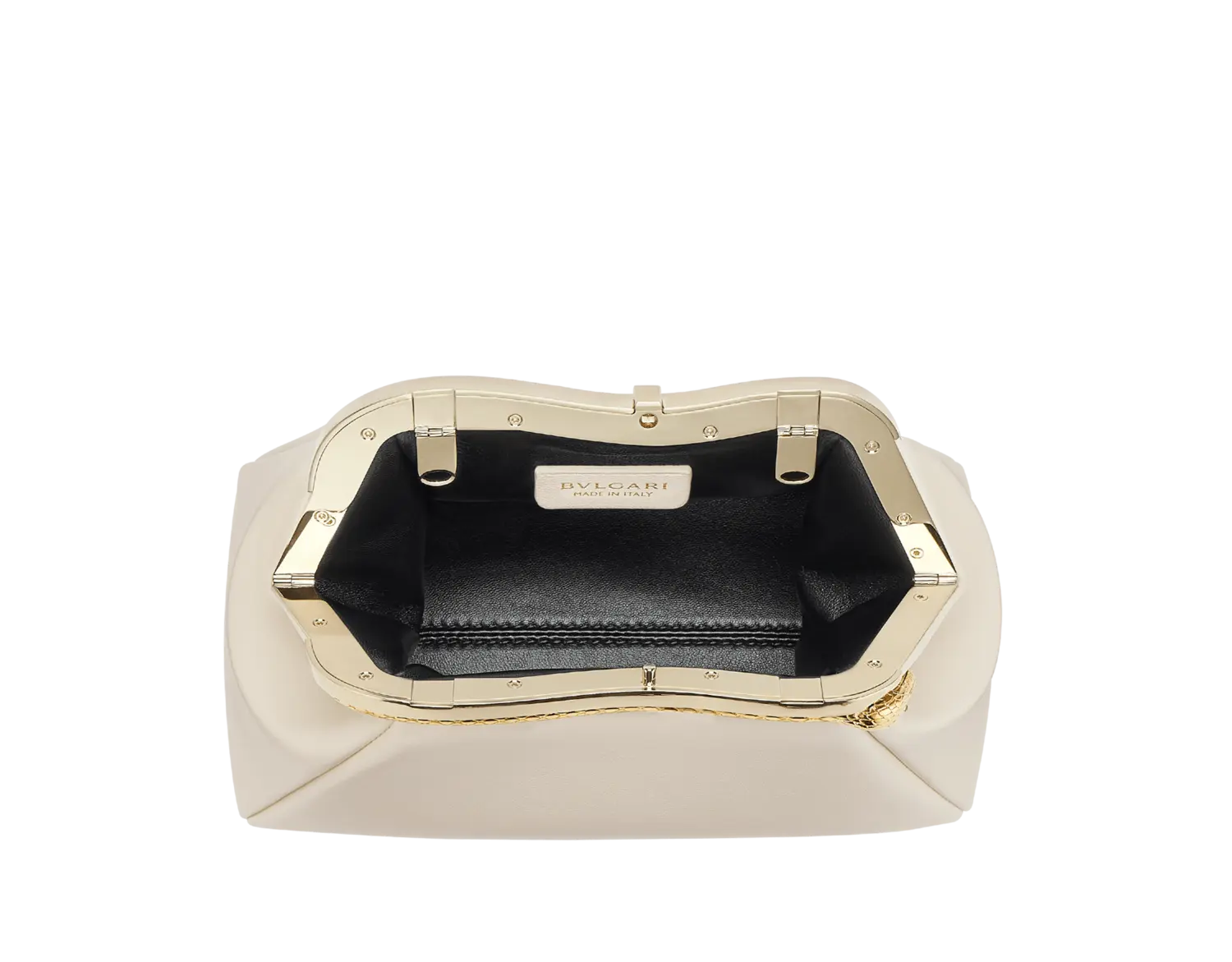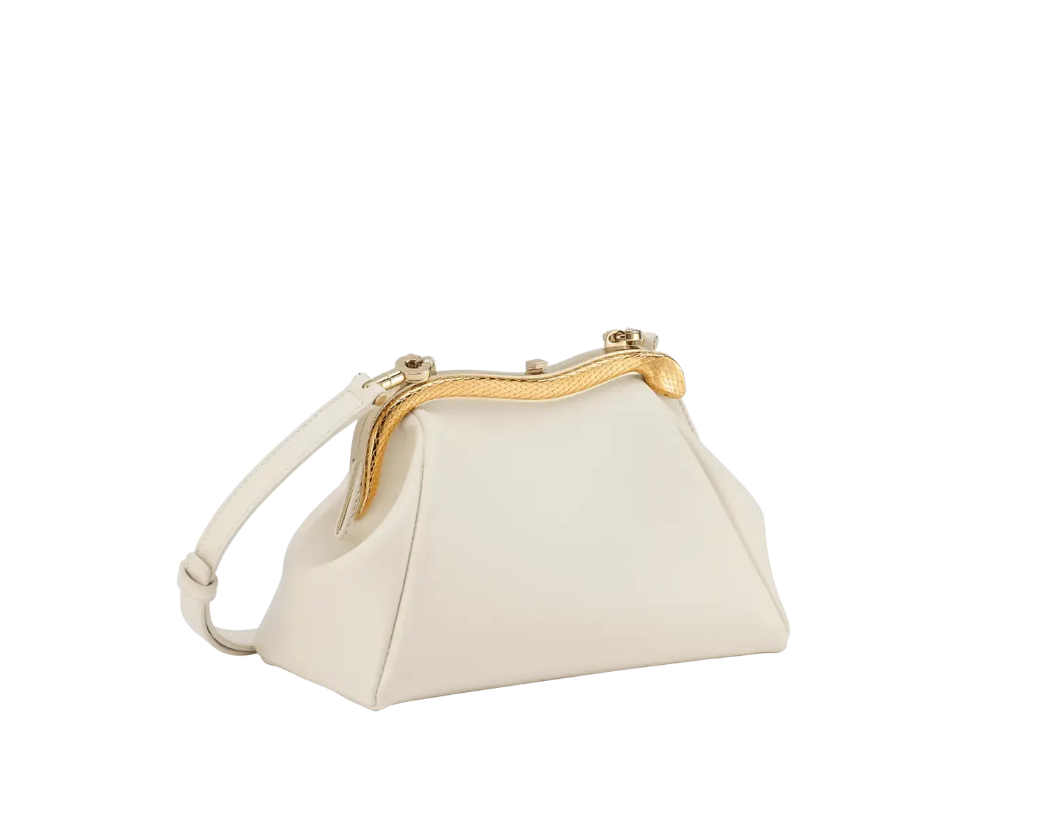 Смелое переосмысление вневременной иконы, маленькая сумочка Serpentine из гладкой телячьей кожи цвета слоновой кости и опала сочетает в себе мягкую модную форму с ювелирными деталями, напоминающими извилистые движения змеи. Эта сумка с позолоченной латунной рамкой в форме тела змеи, вдохновленной смелыми историческими ожерельями Serpenti 1960-х годов, предлагает несколько стилей в одном — ее изогнутый металлический верх украшен выгравированными чешуйками и красными эмалевыми глазами спереди для гламурного образа, а простая вставка из телячьей кожи сзади для более непринужденного отношения. Модель дополняется одним отделением, застежкой на кнопку, кожаным ремешком и металлическим логотипом Bvlgari сзади. 19,5 x 14 x 10 см - 7,7 x 5,5 x 3,9 дюйма. Сделано в Италии.