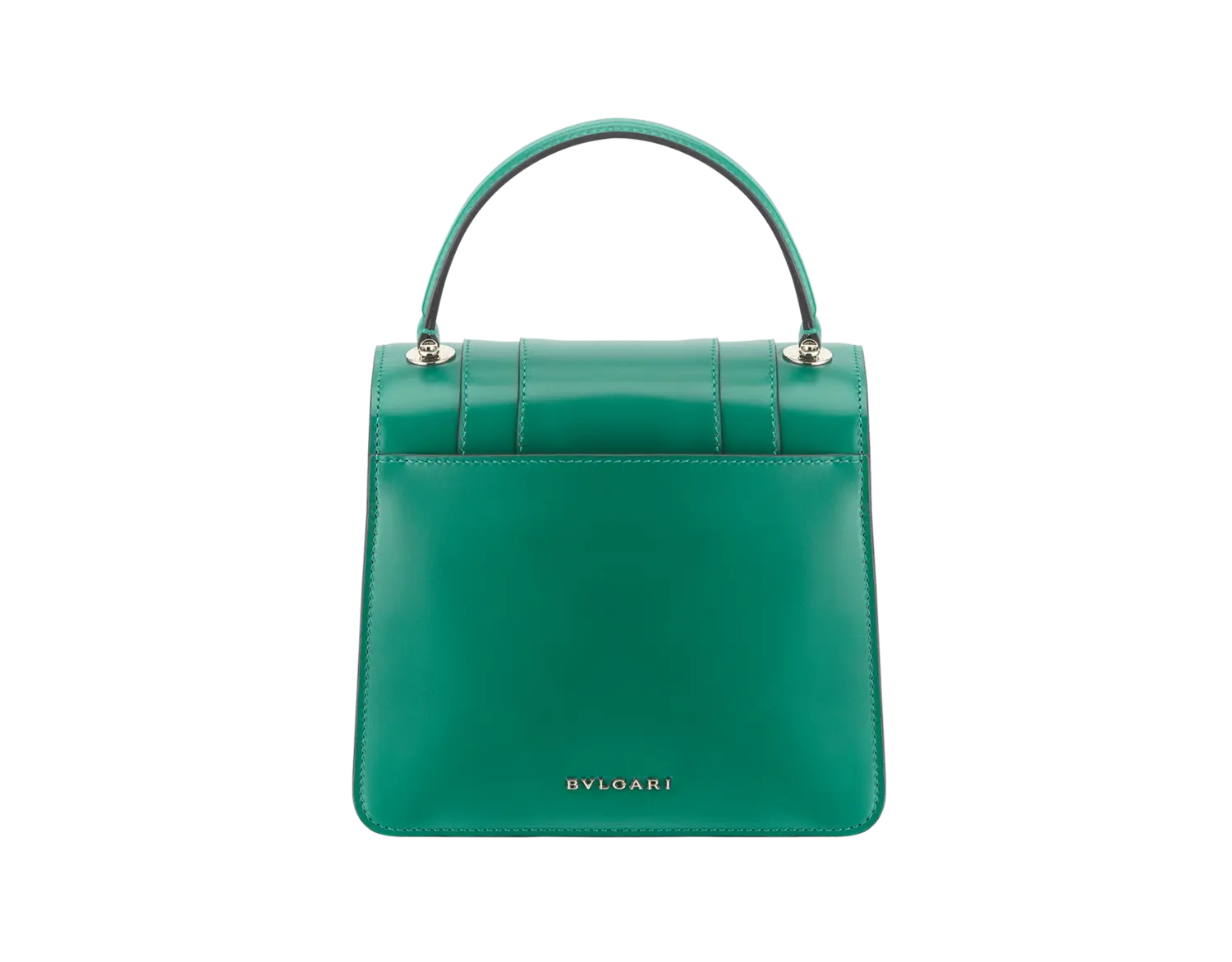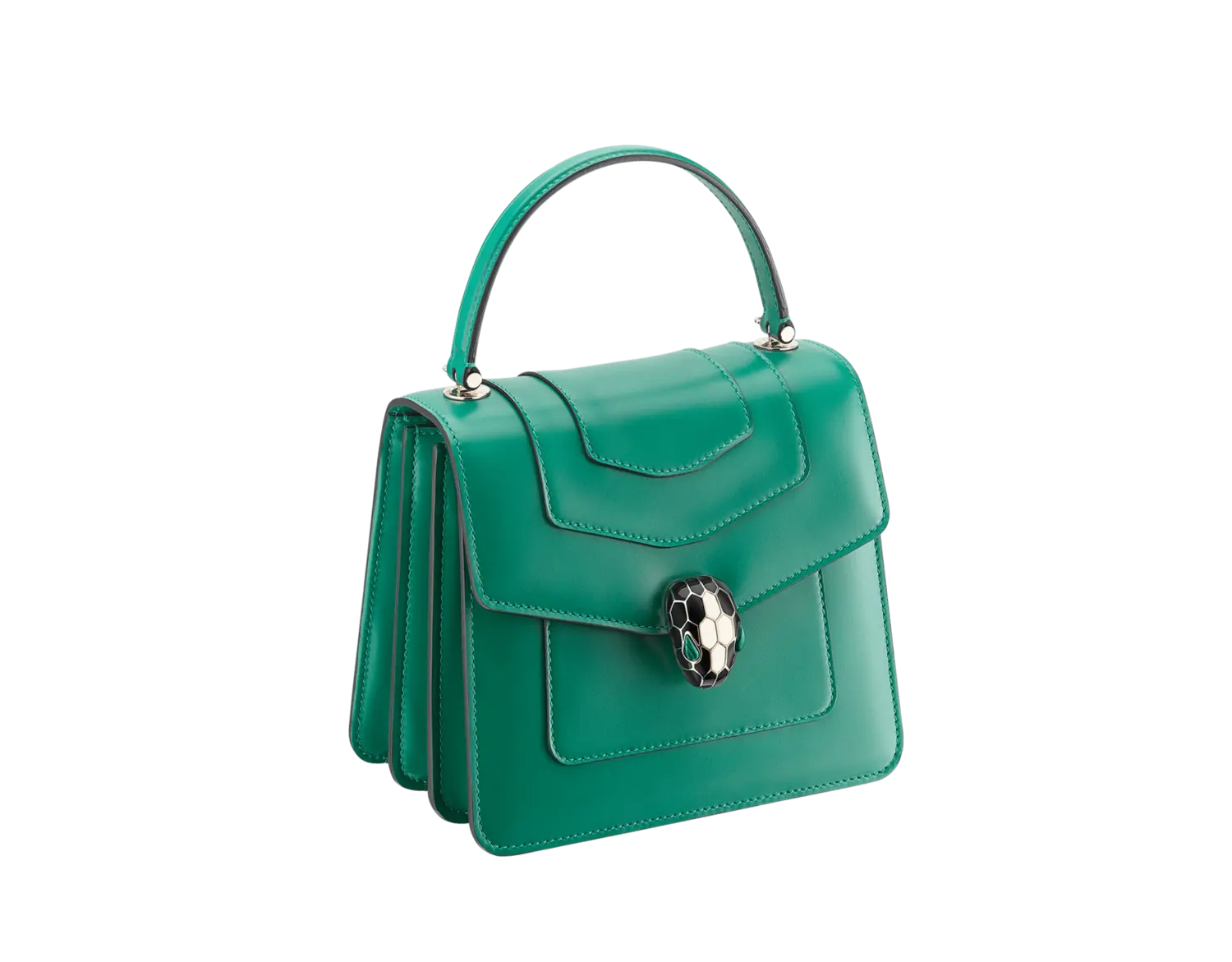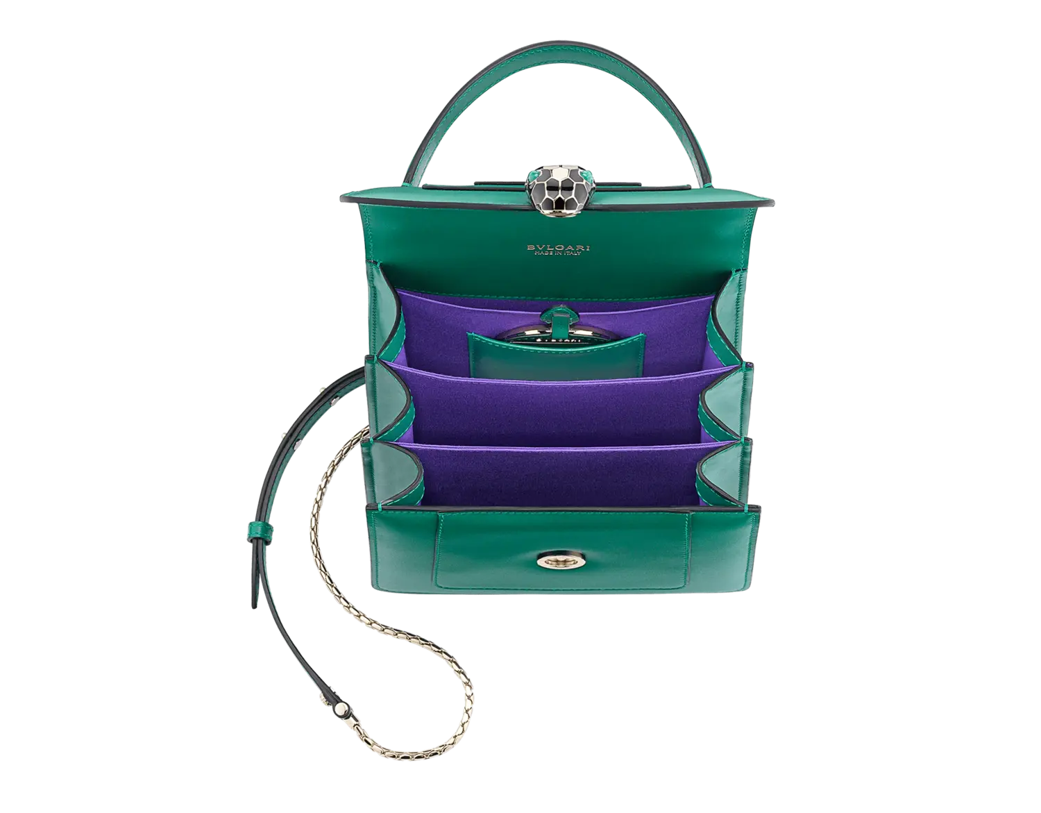 Сумка Serpenti Forever small с верхней ручкой из телячьей кожи изумрудно-зеленого цвета с аметистово-фиолетовой подкладкой из репсовой ленты. Очаровательная застежка в виде змеиной головы из светло-золотой латуни, украшенная черными и белыми агатовыми эмалевыми чешуйками и зелеными малахитовыми глазами. Сумка Serpenti Forever small с верхней ручкой и очаровательным корпусом из телячьей кожи изумрудно-зеленого цвета сочетает в себе современный стиль и универсальность для повседневной носки. Снабженная цепочкой в форме змеи с кожаным ремешком, творение увенчано культовой застежкой в виде змеиной головы, завораживающие чешуйки и дизайн которой черпают вдохновение из драгоценностей Serpenti 60-х годов. Модель имеет три отделения, внешний накладной карман сзади, внутренний открытый карман, карман для зеркала с настраиваемым зеркалом и металлический логотип Bvlgari на спине. 18 x 15 x 11 см - 7,1 x 5,9 x 4,3 дюйма. Сделано в Италии.