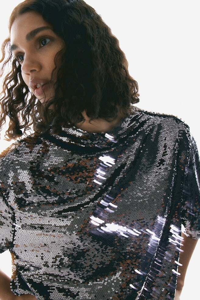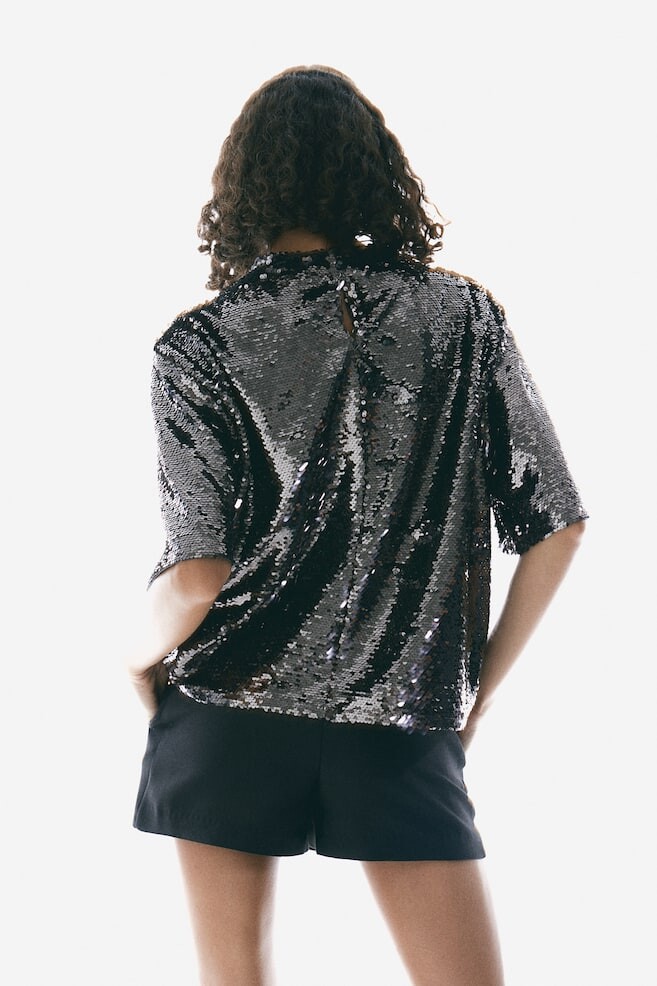 Короткая рубашка из сетки с пайетками. Свободный крой с небольшим воротником-стойкой и разрезом на шее на пуговицах. Слегка завышены плечи и короткие рукава. Подкладка из джерси. Размер модели: рост модели 177 см/5 футов 10 дюймов, размер M. Длина: короткая Длина рукава: короткий рукав Посадка: свободный крой Воротник : Воротник-стойка Фильм: Замочная скважина.