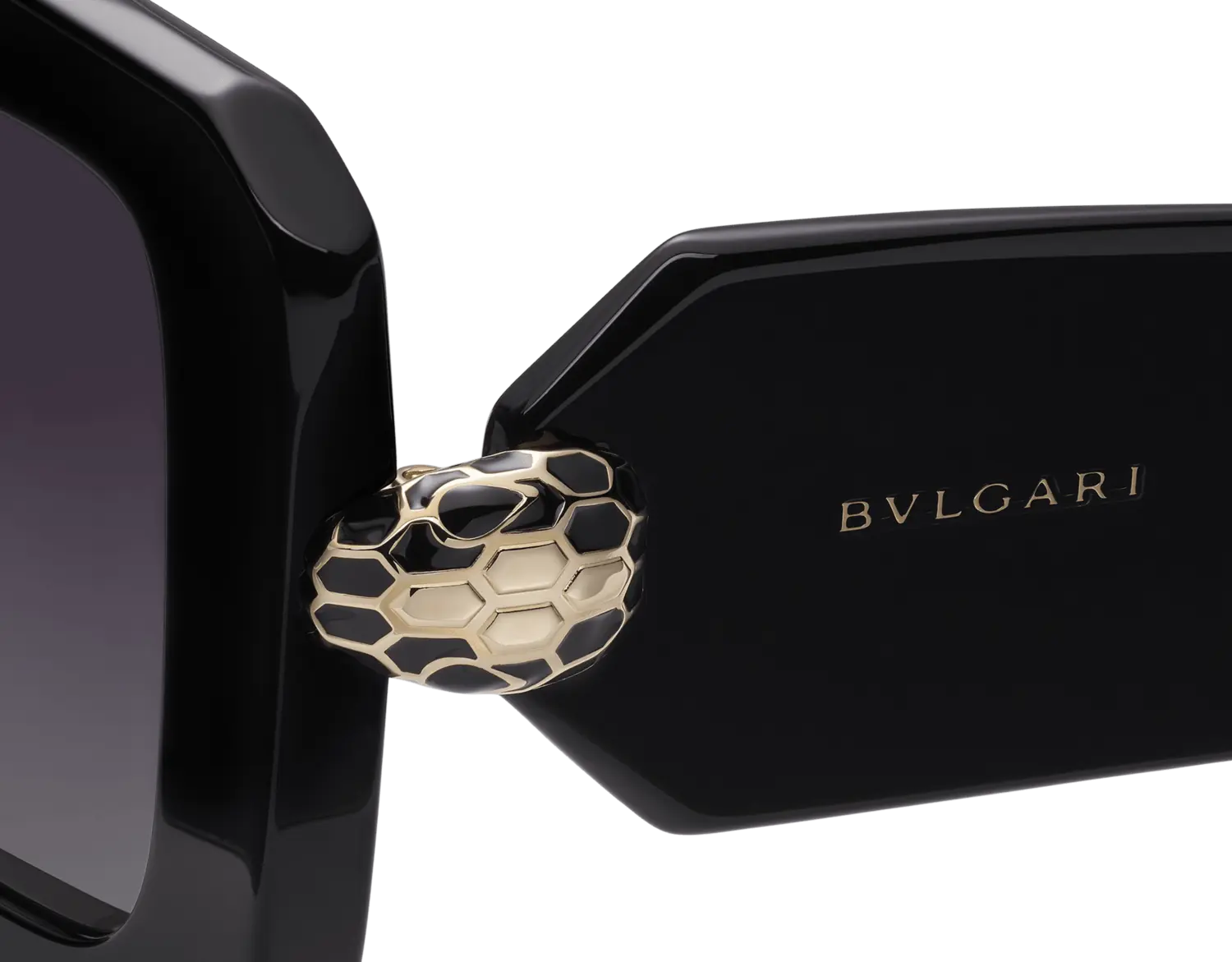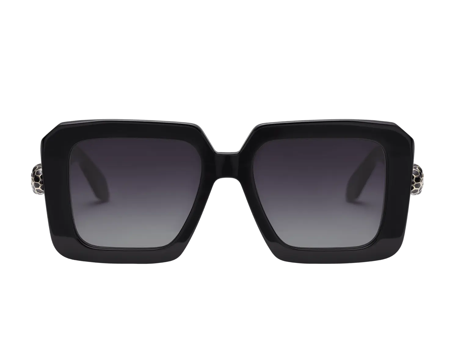 Солнцезащитные очки Serpenti Forever прямоугольной формы из ацетата с эмалированным декором в виде змеиной головы на дужках. Солнцезащитные очки Serpenti Forever с увеличенной прямоугольной оправой из черного ацетата и градиентными серыми линзами. Вдохновленные культовой застежкой сумок Serpenti, заушники украшены драгоценной змеиной головой, украшенной нанесенной вручную эмалью, что делает этот стиль неотразимо пленительным.