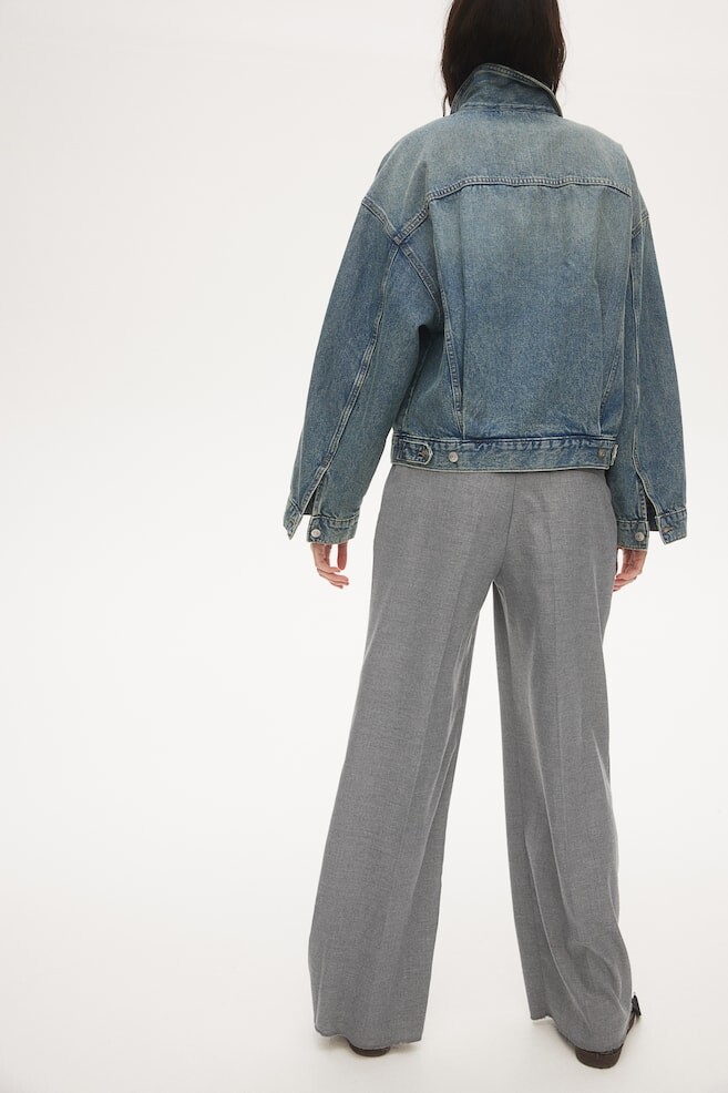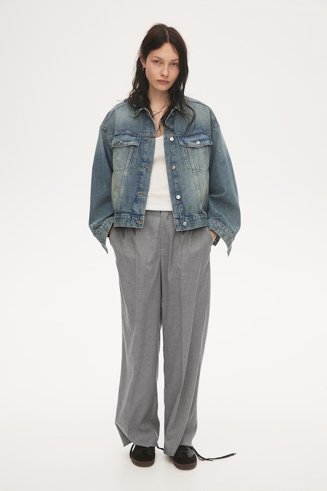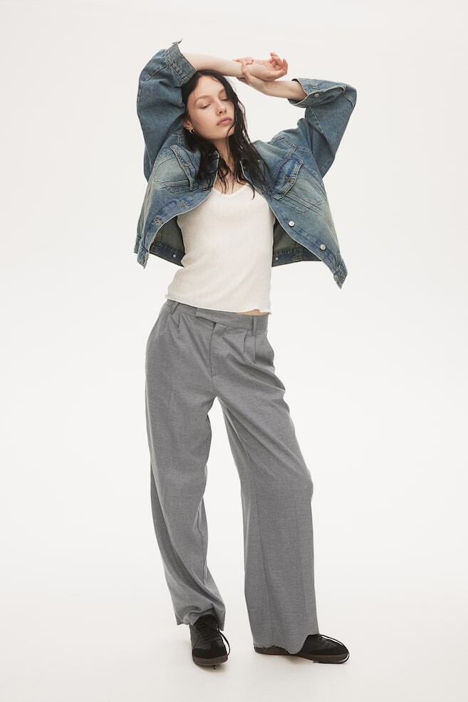 Элегантные брюки свободного кроя со складками из твила. Пояс с клапаном, потайной застежкой на крючок и молнией. Косые боковые карманы, ложные прорезные карманы сзади и широкие прямые брючины с прижатыми складками. Размер модели: рост модели 179 см/5 футов 10 дюймов, на ней размер 38. Длина: длинная Высота талии: Нормальная высота талии Посадка: Свободная посадка Фильм: Прямые штанины, Костюмные брюки, Широкие Концепция: РАЗДЕЛЕННАЯ