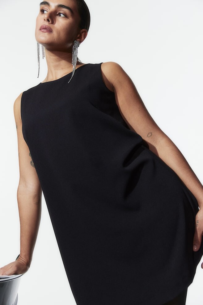 Короткое платье без рукавов привлекательного А-силуэта. Круглый вырез горловины, потайная молния сзади и вытачки на груди для элегантной посадки. Частичная подкладка.