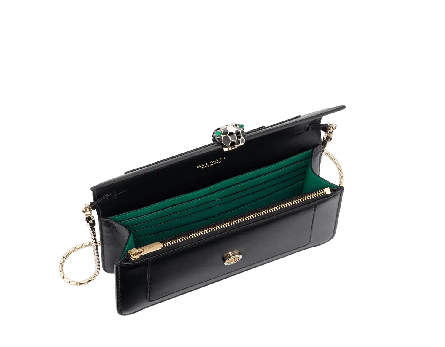 Кошелек на цепочке Serpenti Forever из черной телячьей кожи с изумрудно-зеленой внутренней отделкой из кожи наппа. Очаровательная магнитная застежка в виде змеиной головы из светло-золотой латуни, украшенная черными и белыми агатовыми эмалевыми чешуйками и зелеными малахитовыми глазами. Изготовленный из черной телячьей кожи снаружи и изумрудно-зеленой кожи наппа внутри, кошелек-цепочка Serpenti Forever может похвастаться культовой застежкой в виде змеиной головы, чьи гипнотические цветные чешуйки и дизайн черпают вдохновение из ювелирных изделий Serpenti 60-х годов. Оснащенная цепочкой в форме змеи и кожаным ремешком, модель дополняется магнитной застежкой-клапаном, внутренним карманом на молнии, шестью отделениями для кредитных карт, одним карманом-клинкой, двумя карманами с клапанами и металлическим логотипом Bvlgari на задней стороне. 20 x 12 x 4 см - 7,9 x 4,7 x 1,5 дюйма. Сделано в Италии.